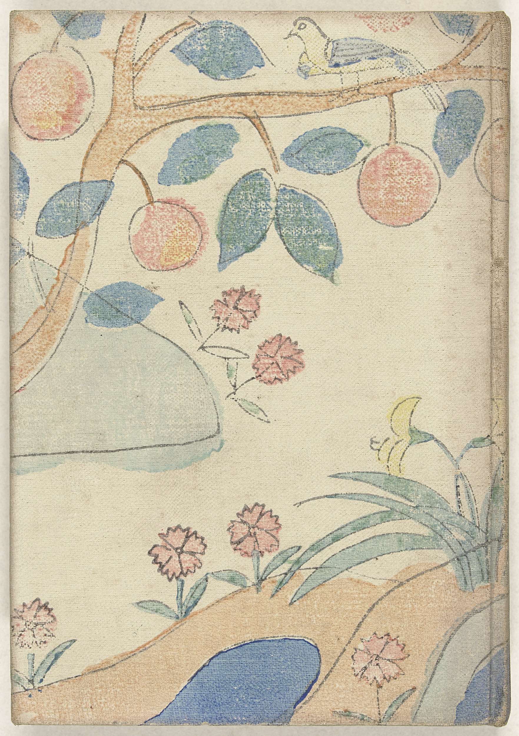 Harde kaft met afbeelding van een boom, vogels en bloemen, door Seifu; titel op de rug; roze dek- en schutblad; titelpagina; bergmeer bij nacht, door Hiromitsu; 1, tweede titelpagina; 2- 482, tekst; laatste pagina, colofon.