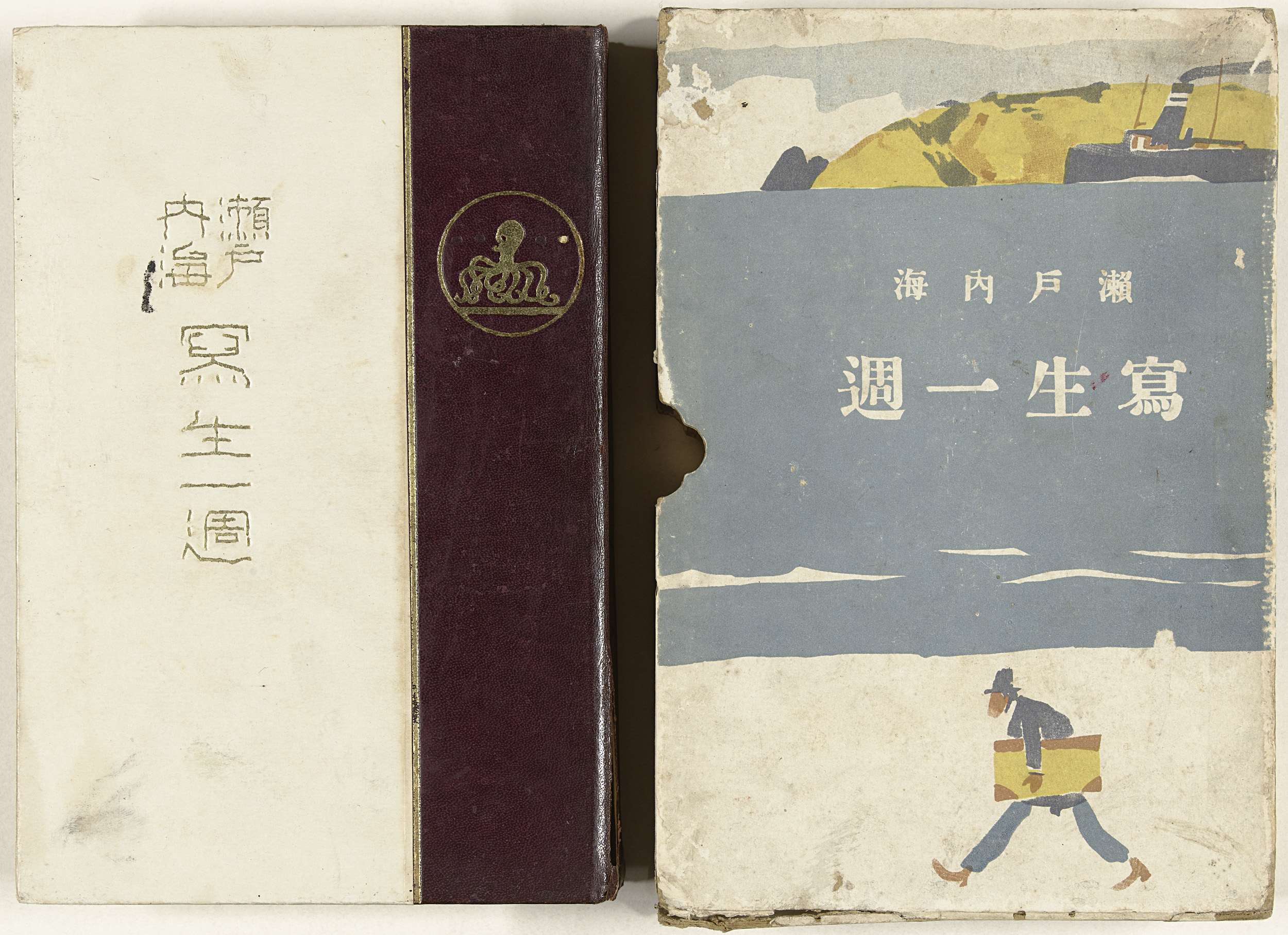 Boek met tekst en illustraties door acht kunstenaars; harde kaft van bruin en wit leer, titel in goud op voorkant en rug; groen en wit dek- en schutblad met afbeelding van zeilschip in water; titelpagina met afbeelding van vis en zeewier; één pagina, inleiding; 1-12, inhoudsopgave; uitvouwbare plattegrond van de Japanse Binnenzee; 104 illustraties in ...
