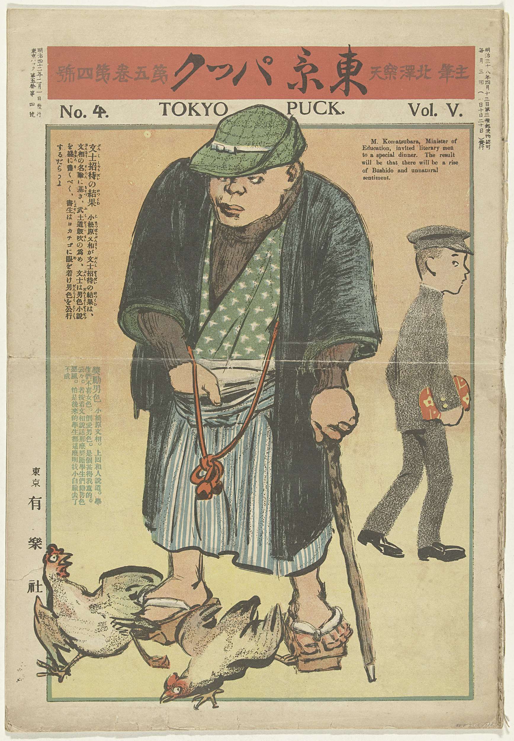 Nummer vier, deel vijf van het satirische tijdschrift Tokyo Puck, uitgegeven door Yurakusha in Tokyo; acht bladen, genummerd: 1, voorpagina met afbeelding van twee mannen en twee kippen; 2-16, cartoons en tekst in Japans, Chinees en Engels.