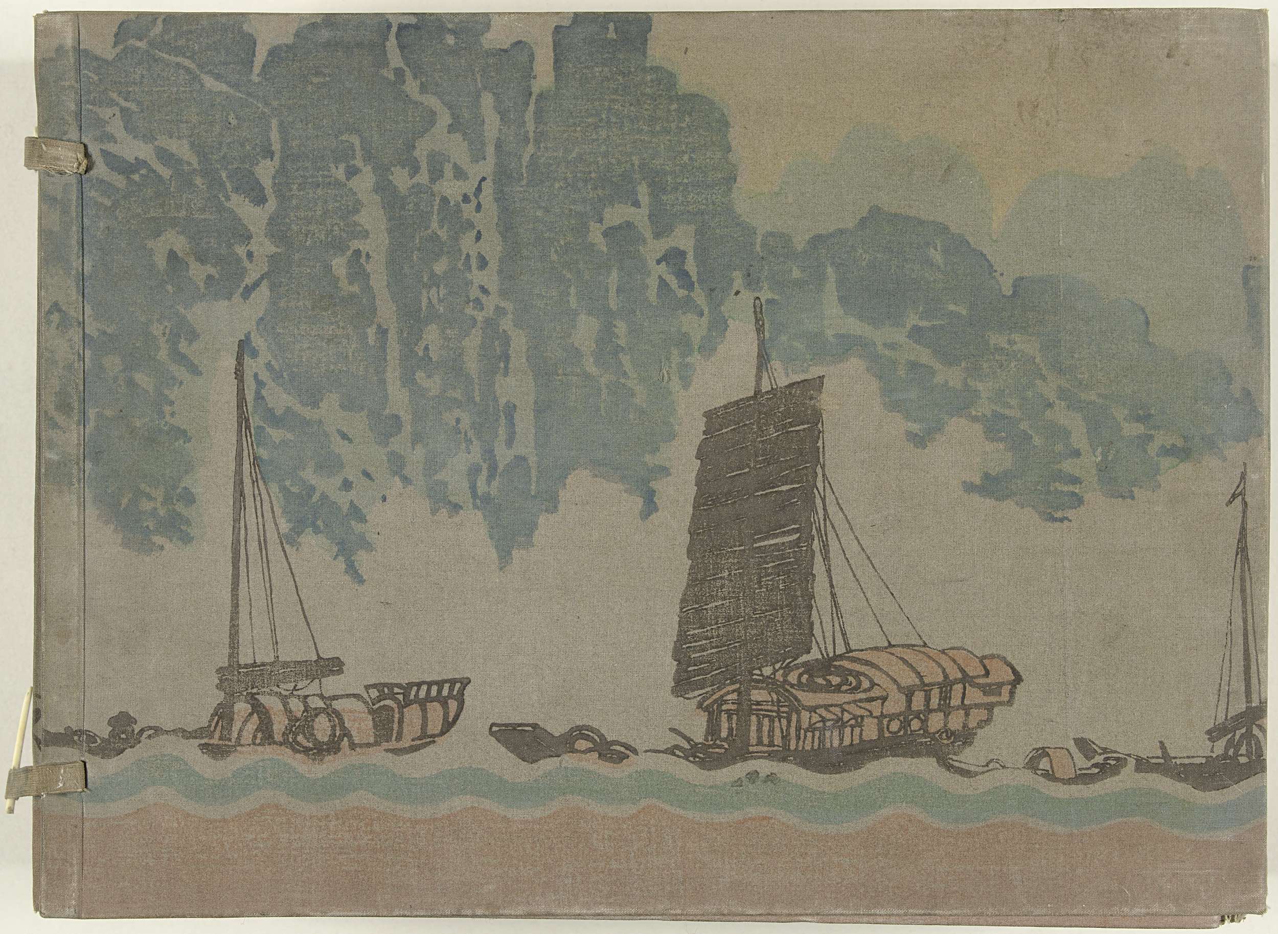 Twee delen (comlpeet) met prenten en reproducties van rolschilderingen met landschappen in China. In originele omslag met afbeelding van schepen op rivier in berglandschap; bewaard in roodbruine omslag met linksboven blanco titelstrook.