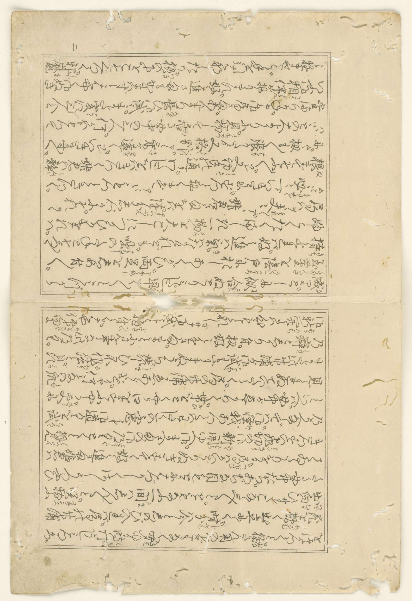 Voorlaatste tekstpagina van het album Negai no itoguchi (ook wel vertaald met: The prelude to desire). Dubbele pagina Japanse tekst met middenvouw. In linker marge de Japanse aanduiding voor het getal twee.