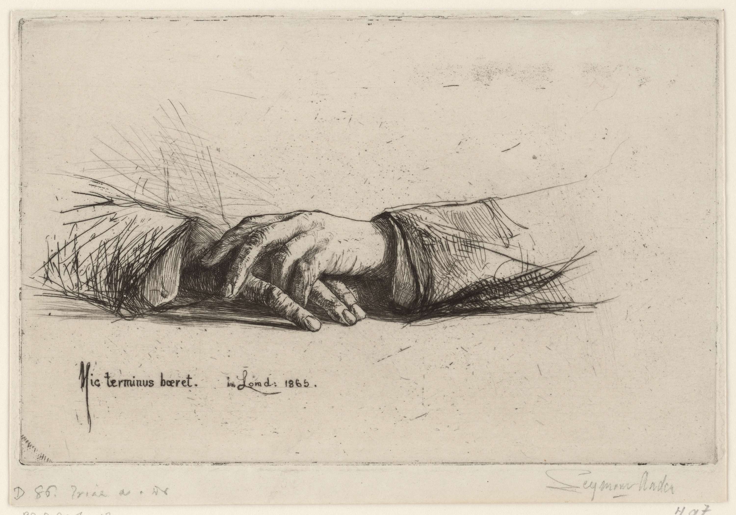 De gevouwen handen van de kunstenaar, rustend op een niet nader gedefinieerde ondergrond. Met opschrift 'Hic terminus haeret': 'Hier is het eindpunt bereikt'. Dit blad heeft dienst gedaan als de laatste prent in de 'Etudes a l'eau-forte', een visuele grap van de kunstenaar.