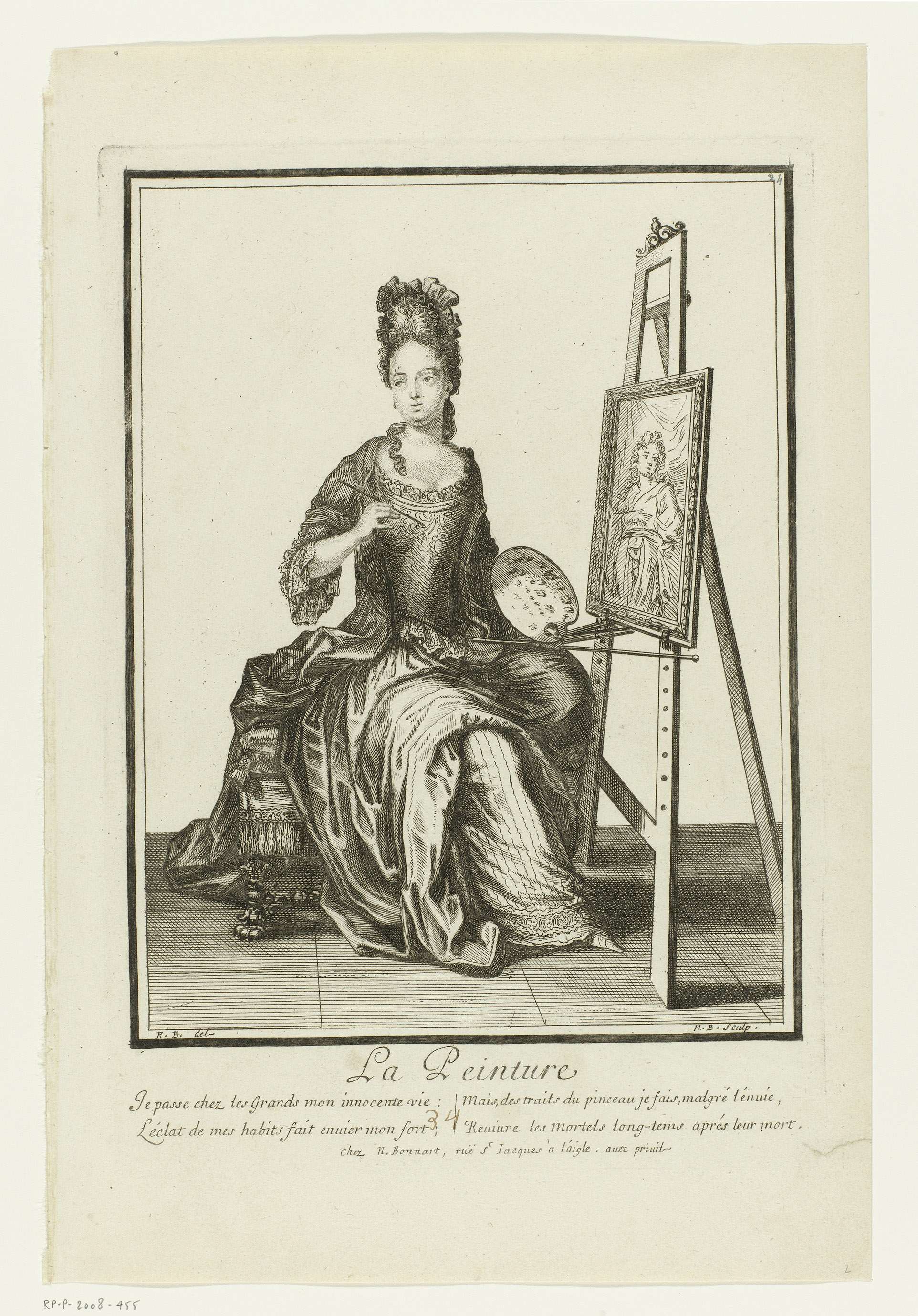 Vrouw met fontange, zittend voor een ezel met een palet, schilderstok en penseel in de hand.