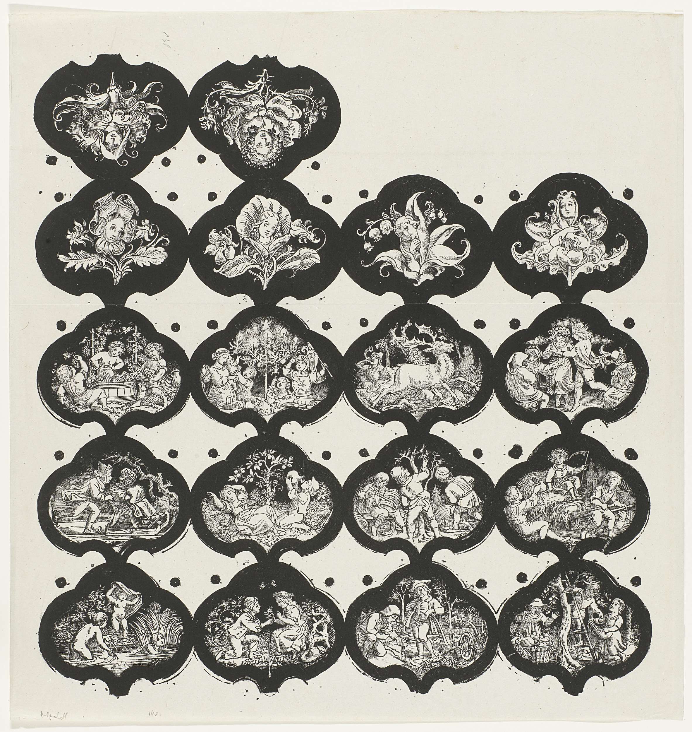 Zeventien vignetten met verbeeldingen van de twaalf maanden en bloemen met meisjesgezichten
