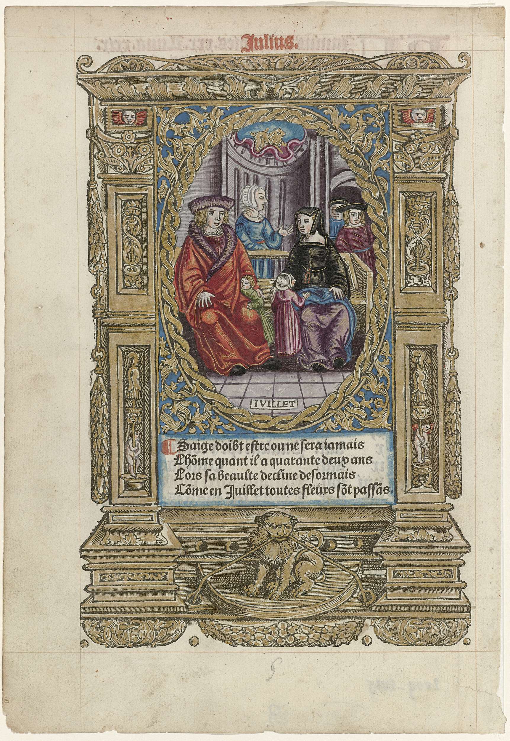 De maand juli: Boekblad: elegant geklede dame en heer, zittend in een vertrek op een bank. Bij hen twee kinderen. Drie figuren achter hen. In ovale lijst, welke is gevat in ornamentale architectonische omlijsting met middenonder een leeuw. In cartouche 4-regelig Frans onderschrift over de veertig-jarige leeftijd van de mens en de maand juli. Verso: ...