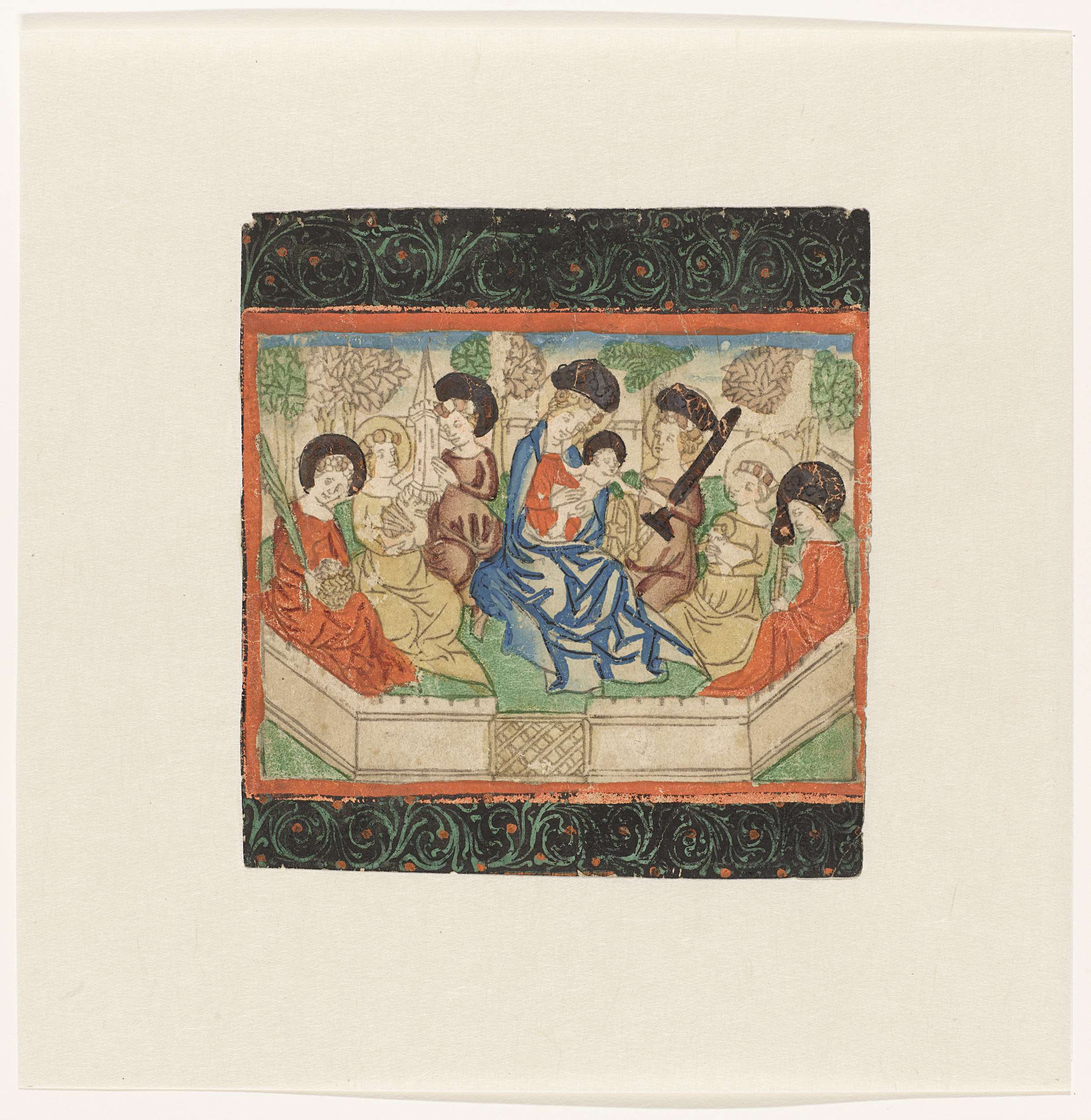 Maria met Christus in het midden, geflankeerd door de H. Barbara en de H. Catharina en vier andere vrouwelijke heiligen, gezeten in een omsloten hof. Marge onder en boven houtsnede beschilderd met blad- en rankenornamenten.