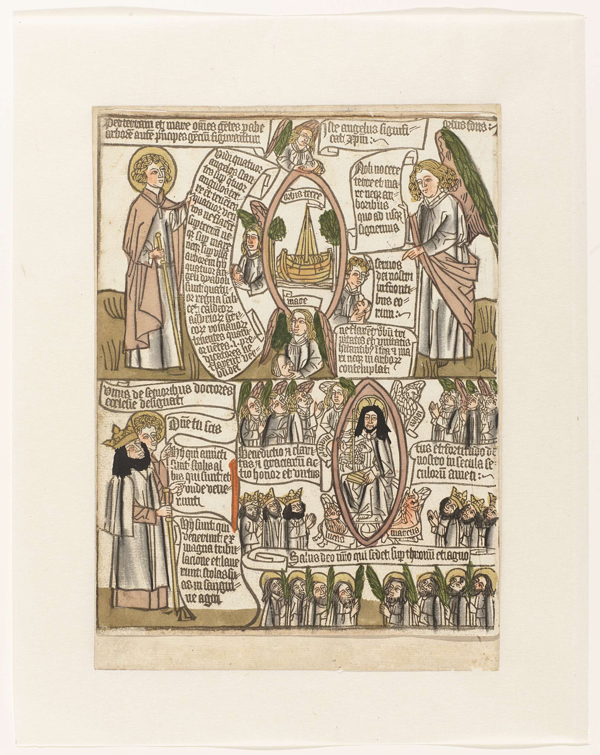 In de bovenste zone in een mandorla verbeelden twee bomen de aarde en een schip de zee. Rondom de mandorla vier engelen die de hoofden van de vier winden vast houden met hun handen over de monden om hen in bedwang te houden. Rechts een andere engel die de vier opdracht geeft de aarde en ...
