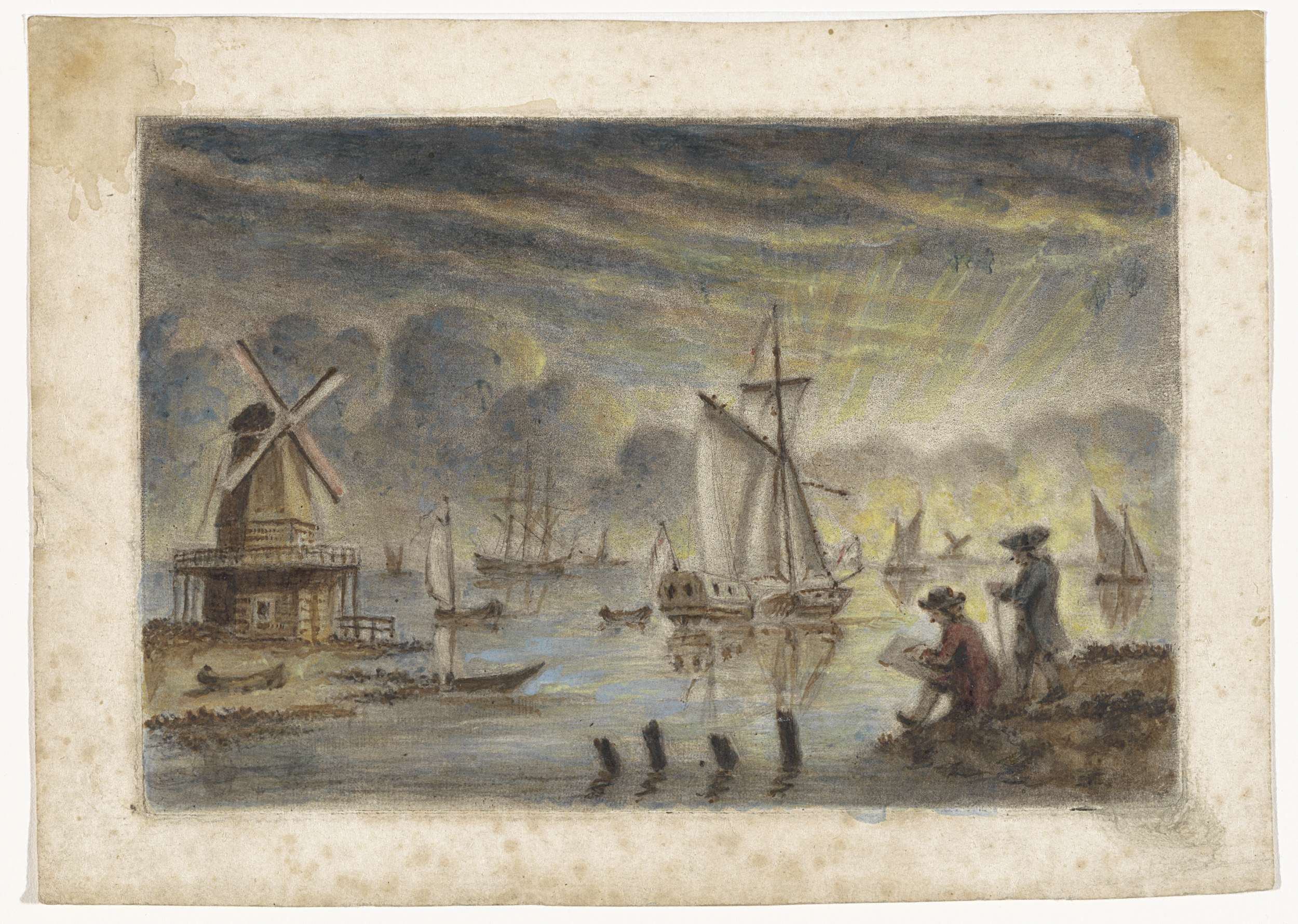 Kustgezicht met schepen, molen en een tekenaar. In de achtergrond een wolkenlucht met daarboven de zonnestralen.
