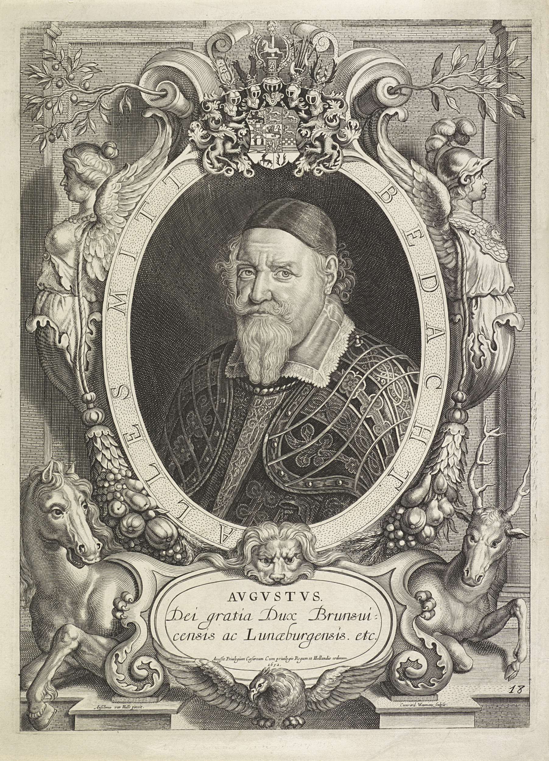 Dit portret werd gemaakt voor een boek waarin alle onderhandelaars werden afgebeeld die aanwezig waren bij de onderhandelingen voor de Vrede van Münster (het einde van de 80-jarige oorlog). Hertog August is hier krijgshaftig in harnas gekleed, maar stond bekend als de geleerdste vorst van zijn tijd. De versiering rond het portretovaal verwijst naar zijn ...
