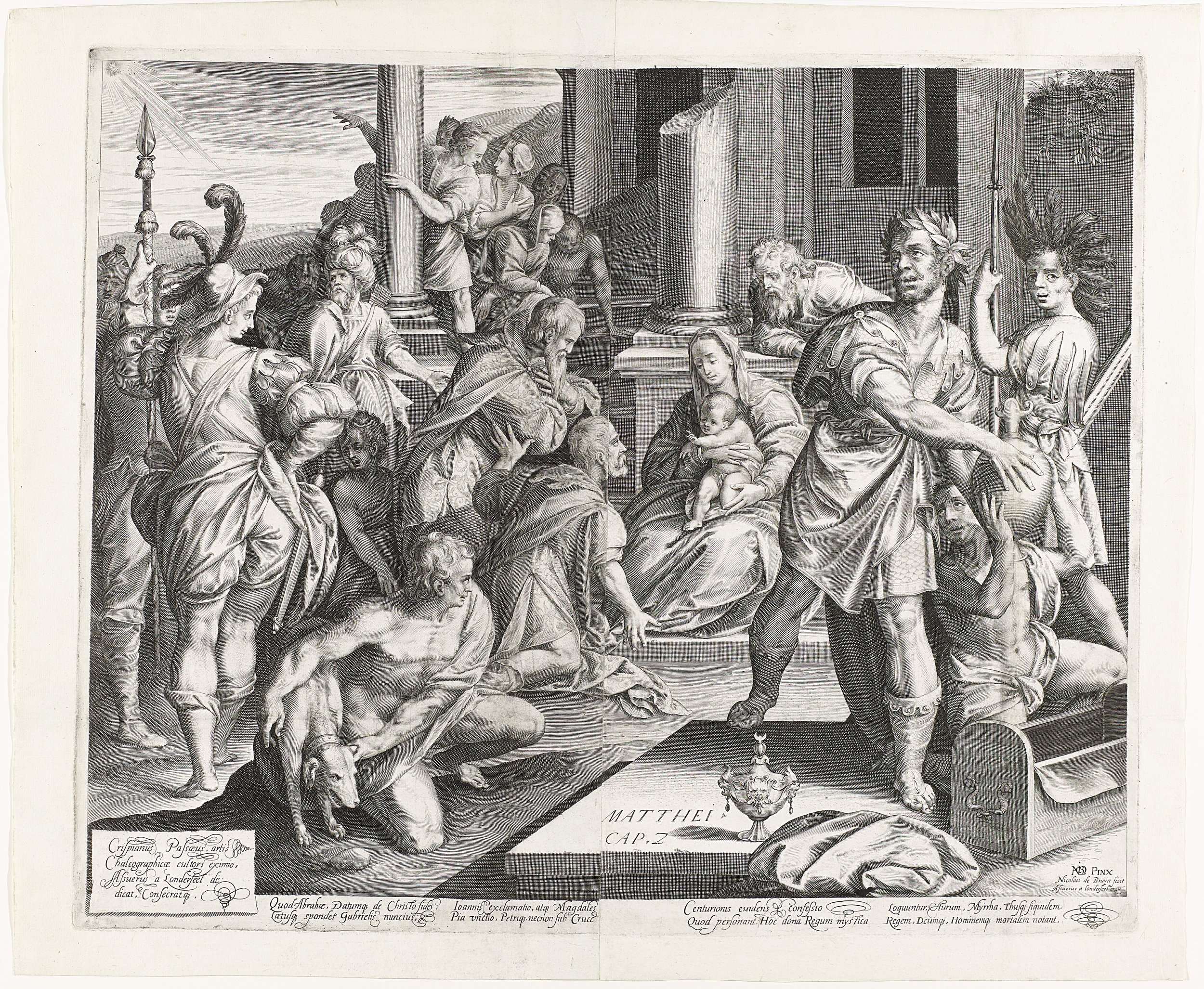 In het midden Maria met kind; de koningen en hun gevolg links; rechts drie bedienden met geschenken, waaronder één met een veren hoofdtooi.