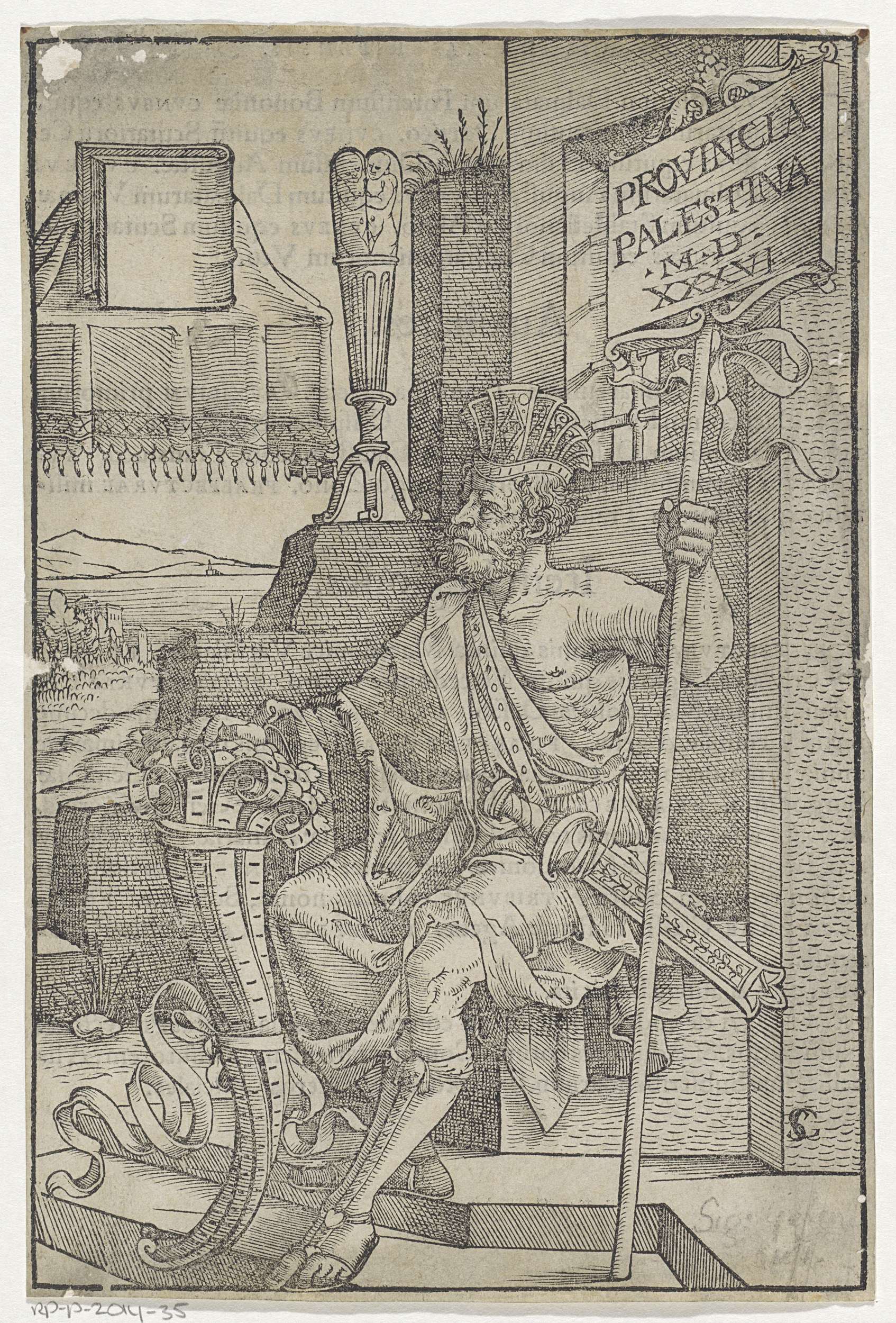 Zittende Romein met een zwaard, een hoorn en een bord met 'Provincia Palestina. M.D. XXXVI'