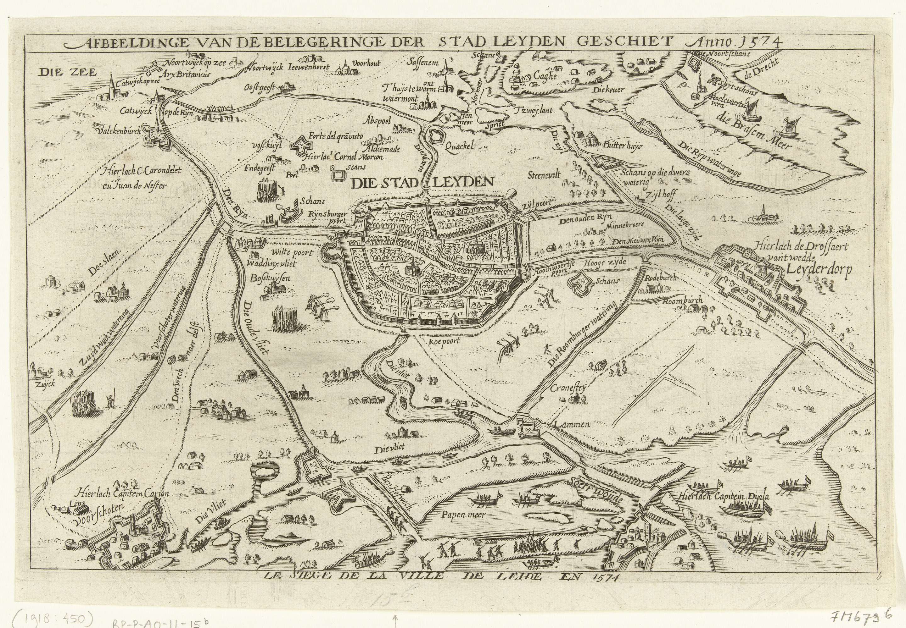 Plan van Leiden en het omliggende gebied tussen Voorschoten, Leiderdorp, het Haarlemmermeer met De Kaag en Katwijk tijdens het beleg van Leiden, 1574. Onderaan bootjes met soldaten op het water.
