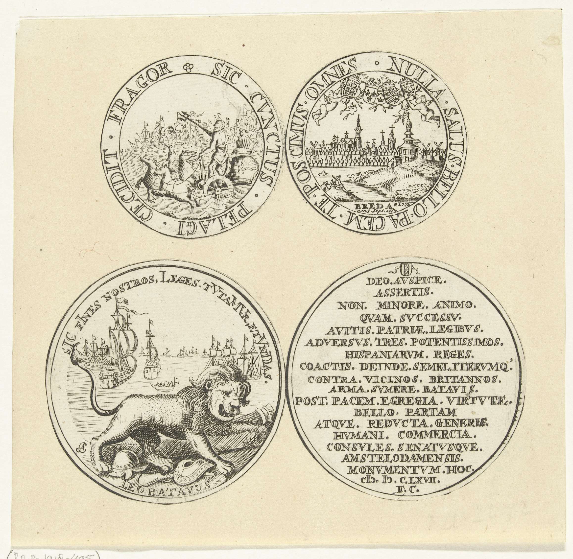 Twee penningen op de Vrede te Breda, 1667. Voor- en keerzijde, uitgeknipt en opgeplakt.