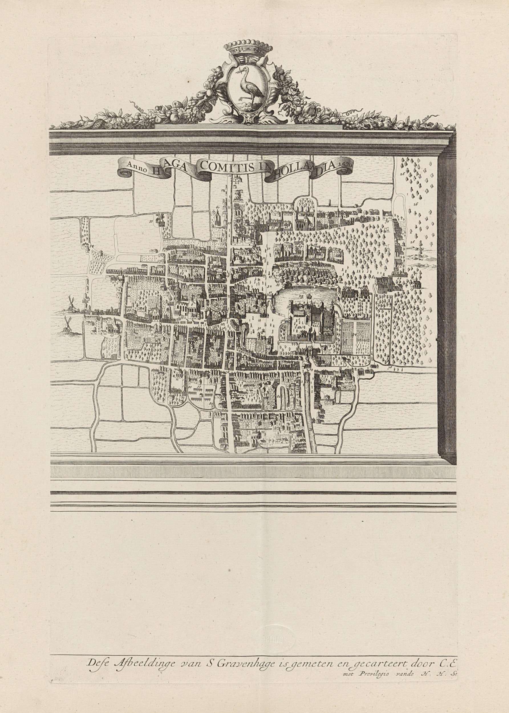 Plattegrond met gebouwen in vogelvluchtperspectief. Linksboven een cartouche met de titel en opdracht, met daaromheen de wapens van Holland en Den Haag (boven) en de familiewapens van vier leden van het stadsbestuur (links en rechts). Linksonder een cartouche met de namen van de twaalf leden van het stadsbestuur en de overige acht familiewapens. Rechtsonder een ...
