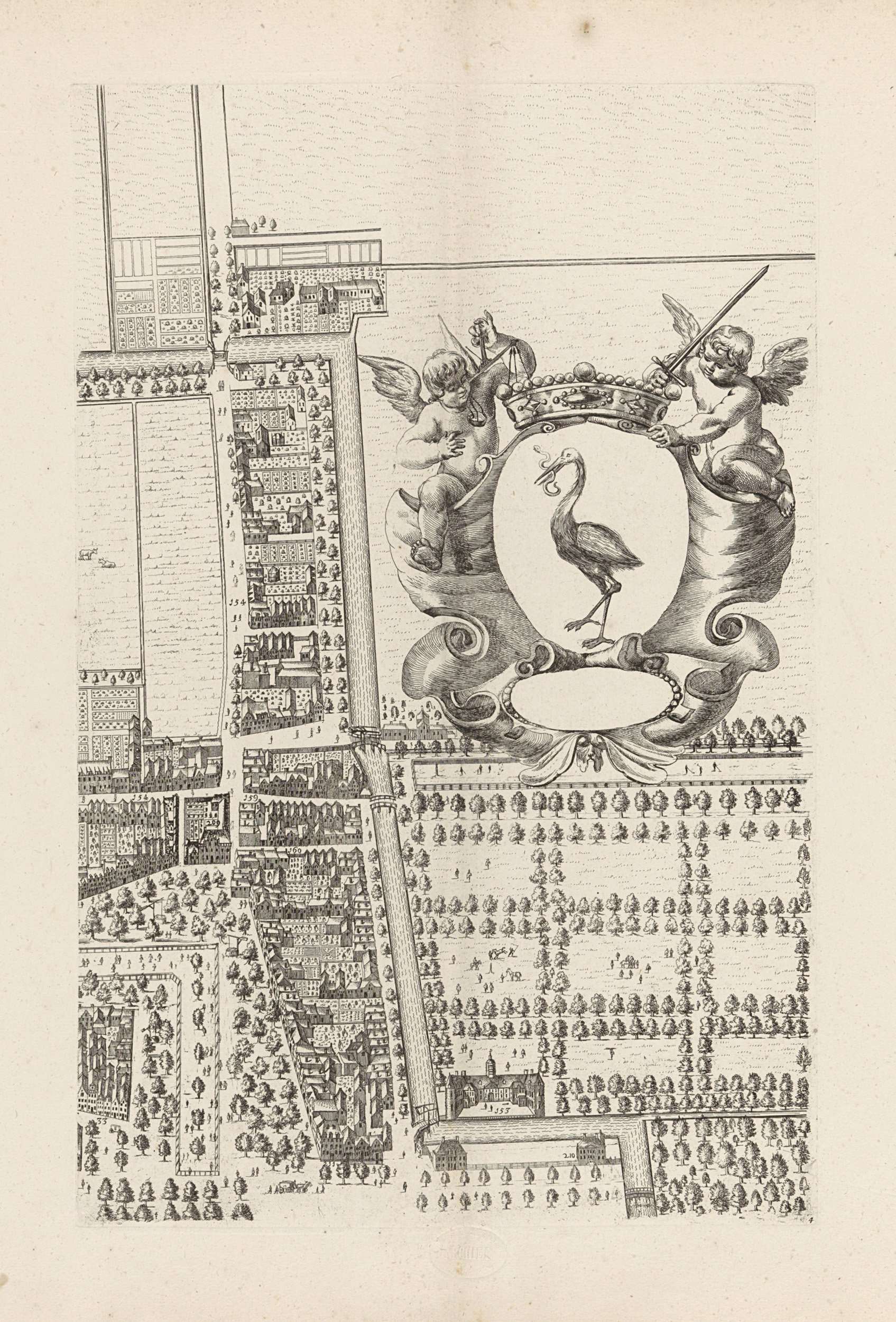 Plattegrond met gebouwen in vogelvluchtperspectief. Linksboven een cartouche met de titel en opdracht, met daaromheen de wapens van Holland en Den Haag (boven) en de familiewapens van vier leden van het stadsbestuur (links en rechts). Linksonder een cartouche met de namen van de twaalf leden van het stadsbestuur en de overige acht familiewapens. Rechtsonder een ...