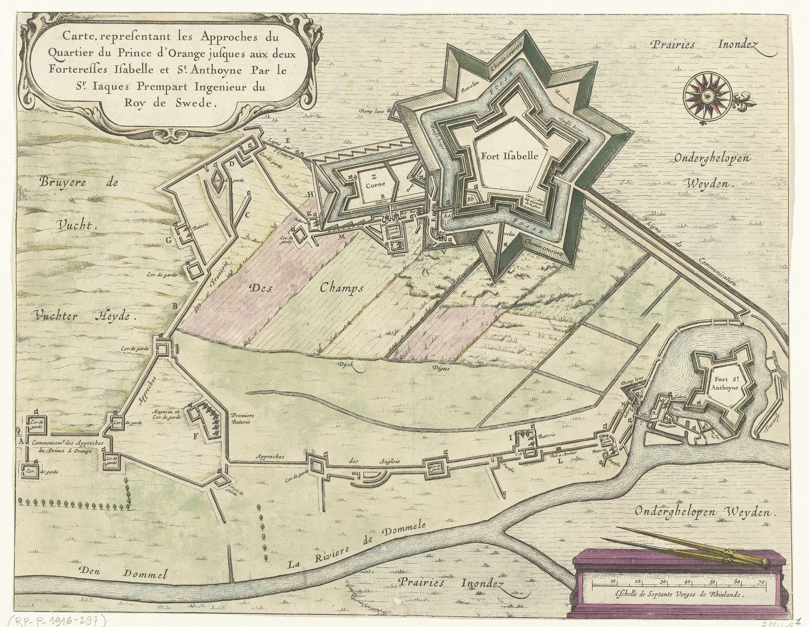 Plattegrond met de loopgraven van het Staatse leger bij de forten Isabella en Sint-Anthonie. Onderdeel van het beleg van Den Bosch door het Staatse leger onder Frederik Hendrik, van 1 mei tot 17 september 1629. Opschriften in de voorstelling in het Frans en Nederlands. Behoort waarschijnlijk bij de grote kaart van het beleg.