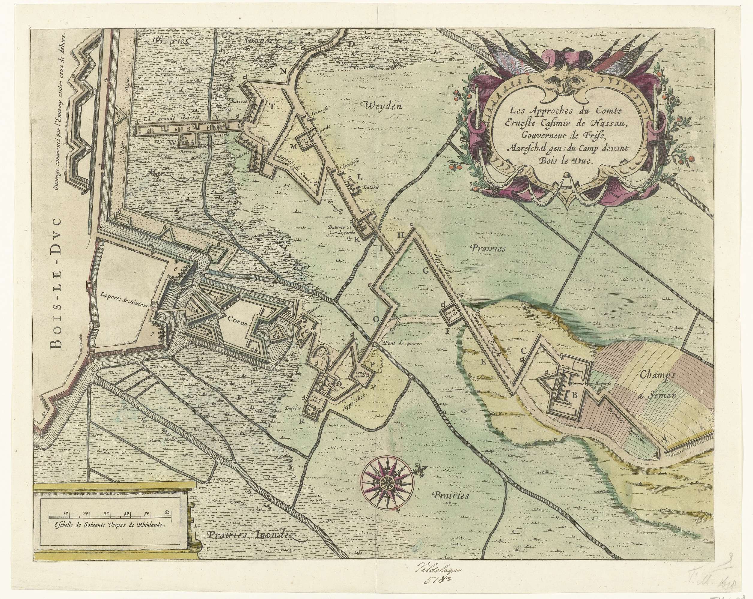 Loopgraven van het Staatse leger onder graaf Ernst Casimir tot aan de stad. Onderdeel van het beleg van Den Bosch door het Staatse leger onder Frederik Hendrik, van 1 mei tot 17 september 1629. Opschriften in de voorstelling in het Frans en Nederlands. Behoort waarschijnlijk bij de grote kaart van het beleg.