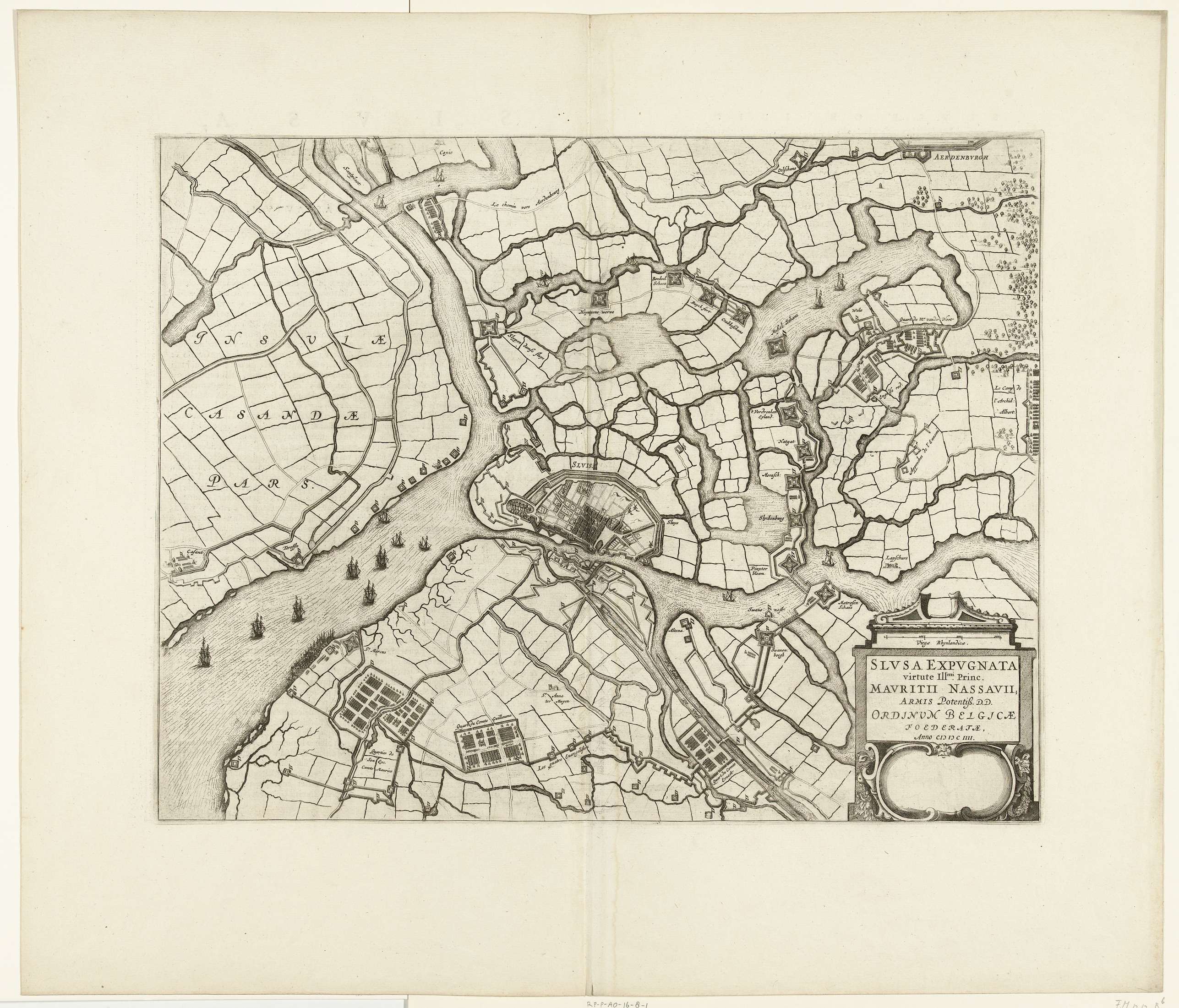 Beleg van Sluis door het Staatse leger onder Maurits, begin mei - 19 augustus 1604. Kaart van Sluis en het omliggende gebied tussen Cadzand en Aardenburg met de kwartieren van de belegerende troepen. Rechtsonder een cartouche met de titel in het Latijn. Op een dubbelblad genomen uit het Stedenboek van Blaeu, bedrukt op achterzijde met ...