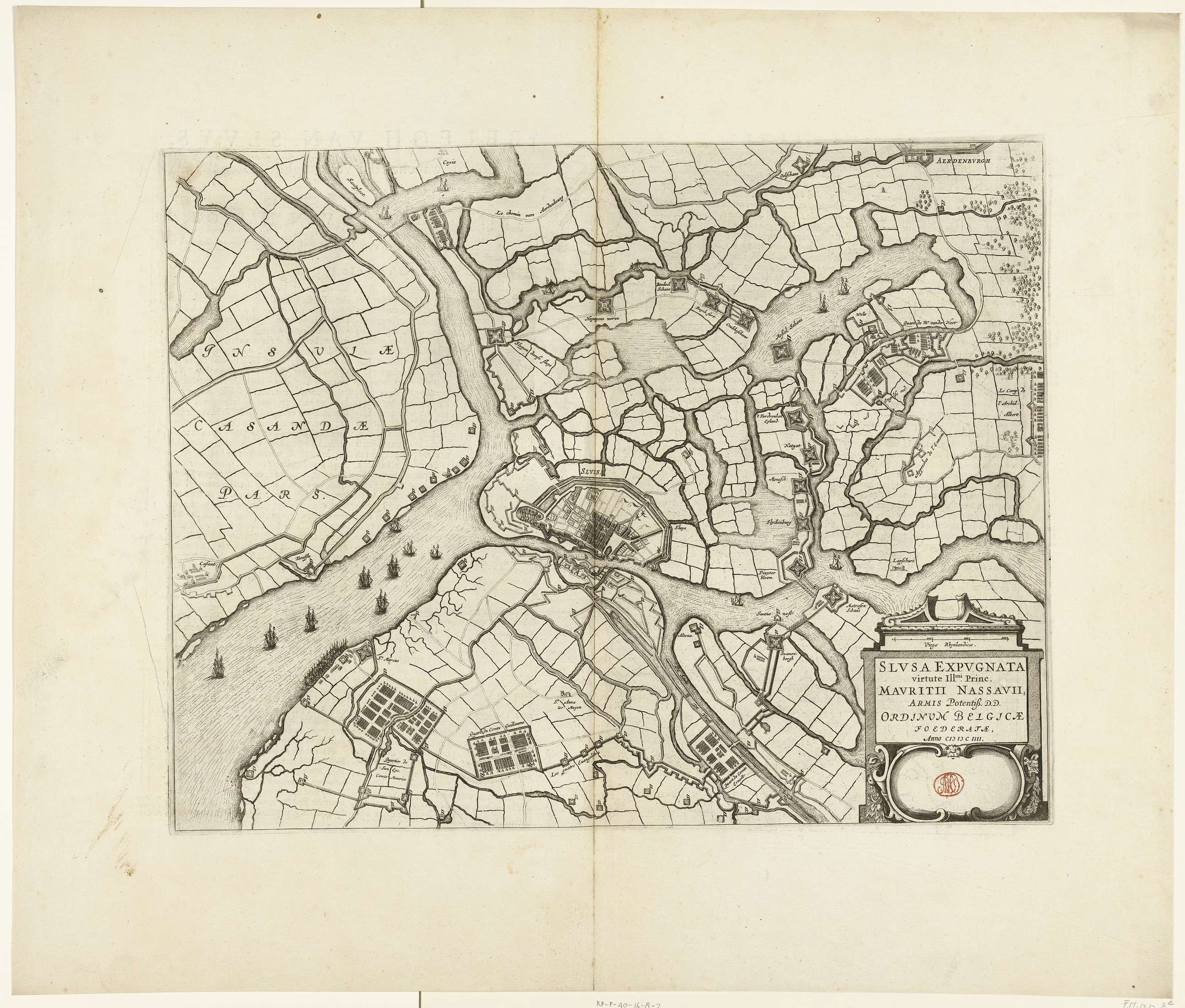 Beleg van Sluis door het Staatse leger onder Maurits, begin mei - 19 augustus 1604. Kaart van Sluis en het omliggende gebied tussen Cadzand en Aardenburg met de kwartieren van de belegerende troepen. Rechtsonder een cartouche met de titel in het Latijn. Op een dubbelblad genomen uit het Stedenboek van Blaeu, bedrukt op achterzijde met ...