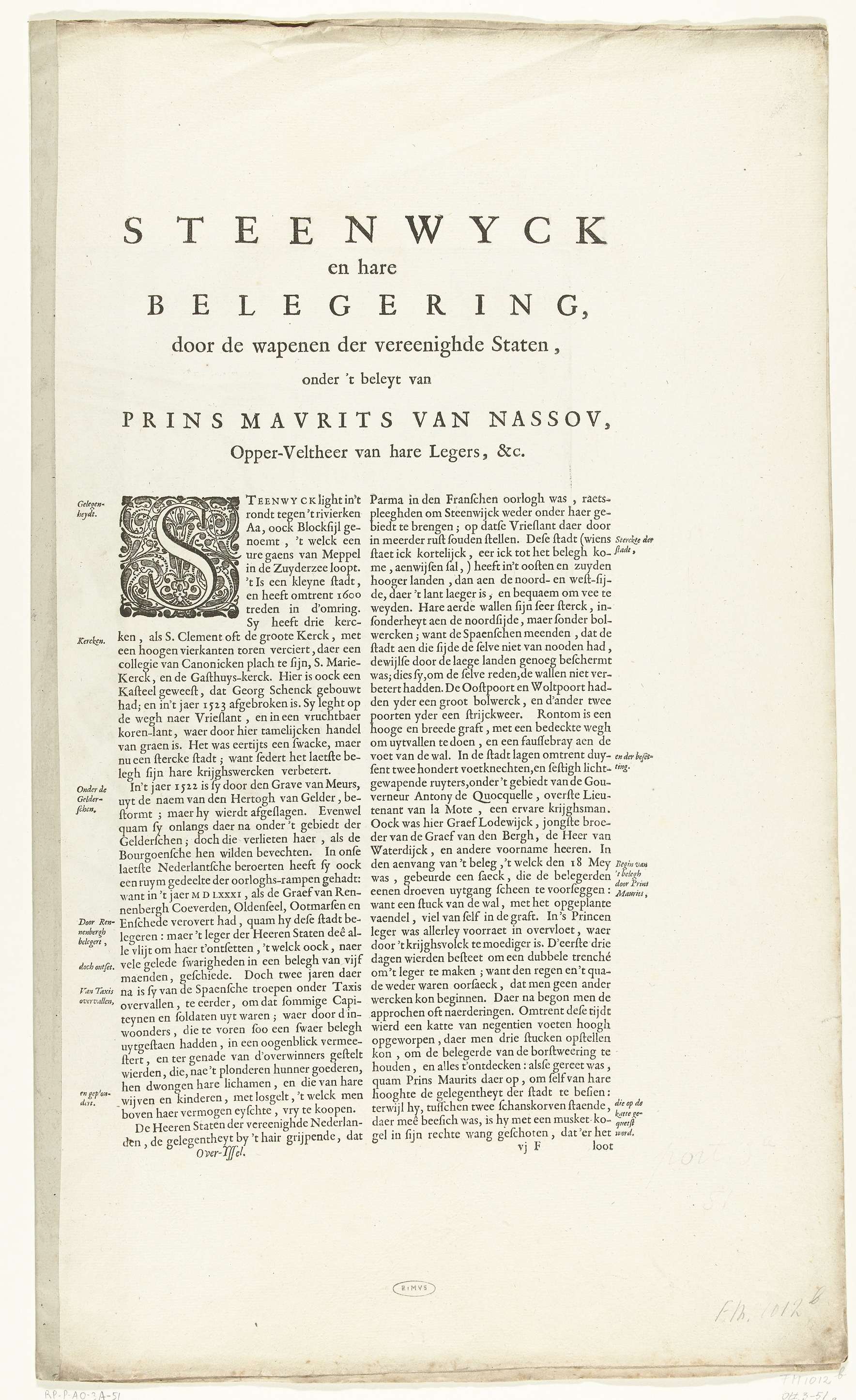 Kaart van Steenwijk belegerd door het Staatse leger onder Maurits, mei - juli 1592. Plan van Steenwijk met de stadswallen en verdedigingswerken en de posities van de belegerende troepen. In de stad zijn alleen twee kerken en enkele straten aangegeven. Bij de stadmuren twee explosies. Op een dubbelblad uit het Stedenboek van Blaeu genomen, op ...