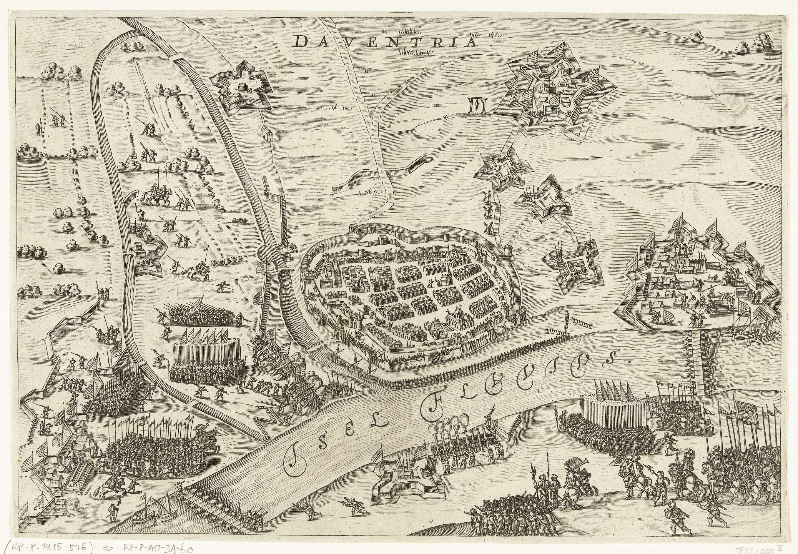 Beleg en inname van Deventer door het Staatse leger onder Maurits, 10 juni 1591. Plan van Deventer en het omringende land met schansen en wallen. Met twee schipbruggen over de IJssel.