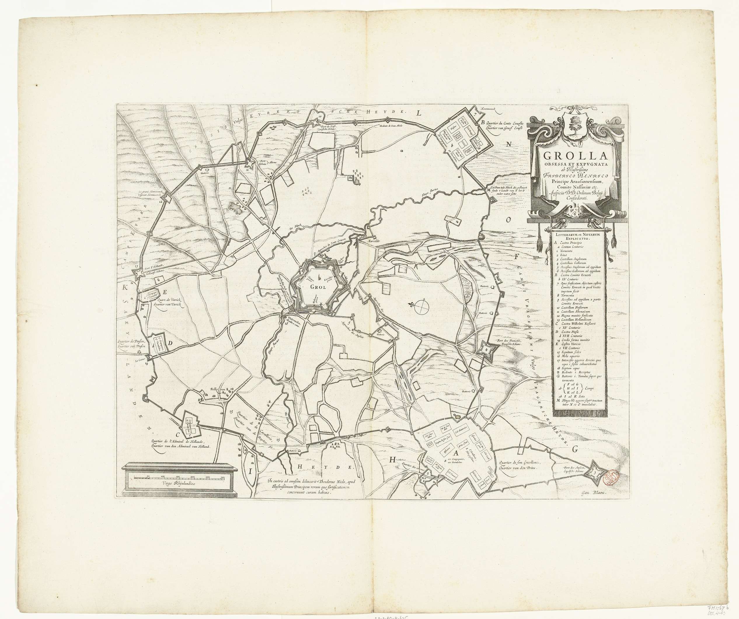 Kaart van het beleg van Groenlo, 1627. Centraal de stad Groenlo, daaromheen de kwartieren van de belegerende troepen. Rechtsboven een cartouche met de titel en de legenda A-O en 1-18 in het Latijn. Opschriften in de voorstellingen in het Frans en Nederlands. Op een dubbelblad genomen uit het Stedenboek van Blaeu, bedrukt op achterzijde met ...