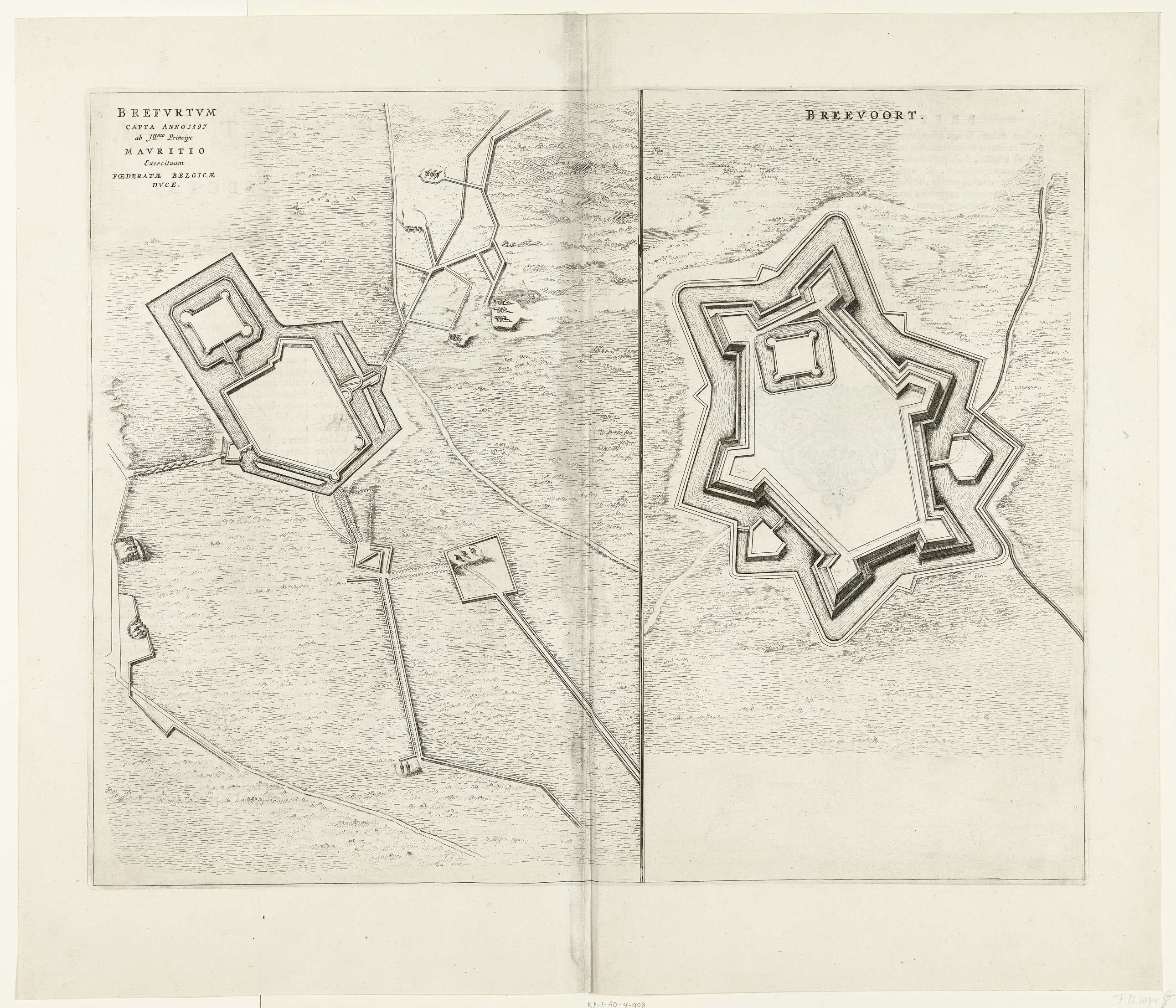 Plattegrond van de stad stad en het kasteel van Bredevoort met de versterkingen, ten tijde van de verovering door het Staatse leger onder prins Maurits, 12 oktober 1597. Dubbel gevouwen blad bedrukt op achterzijde met tekst in het Latijn.