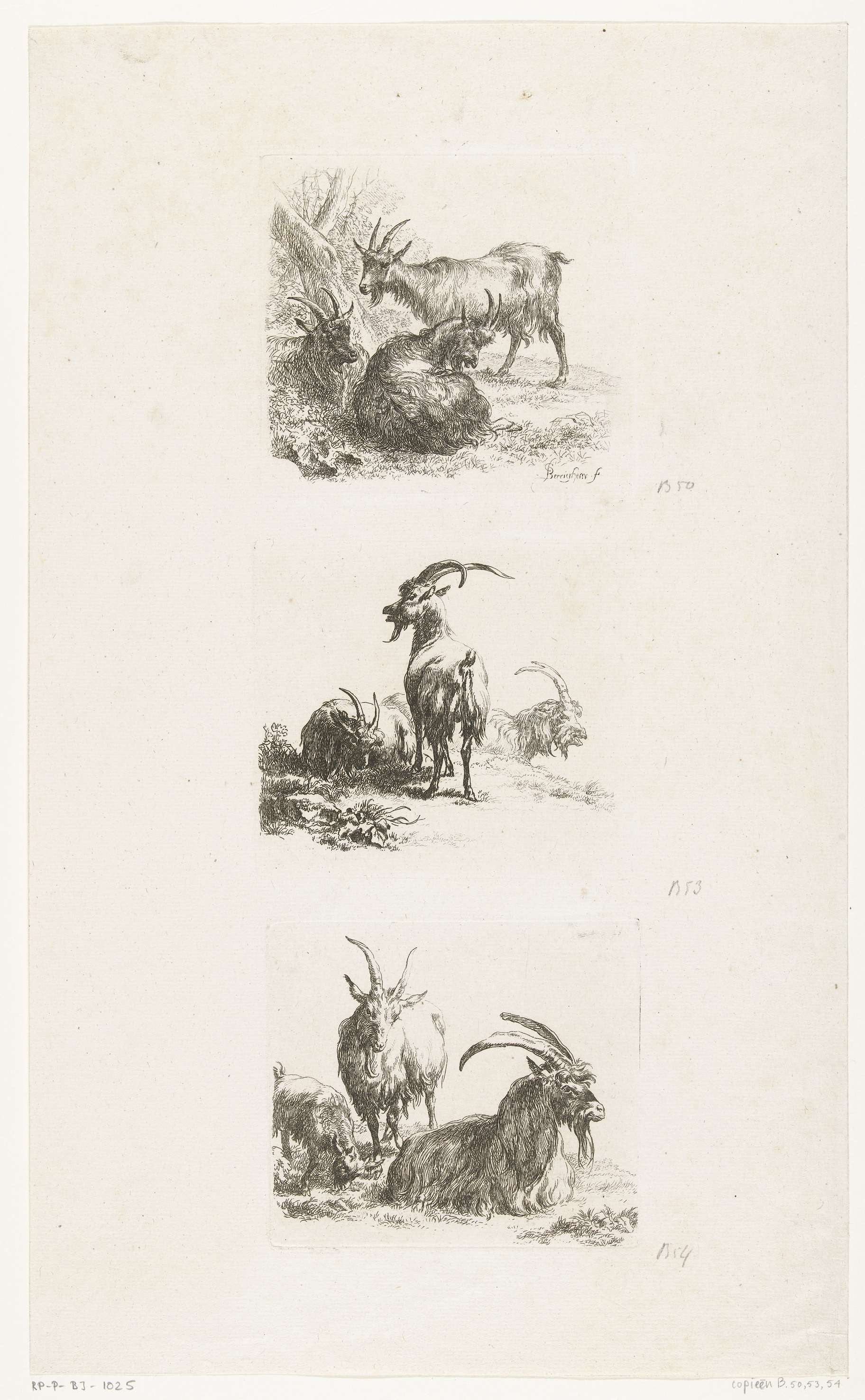 Drie prenten uit een serie van acht prenten met verschillende dieren, op een vel papier afgedrukt. Boven drie geiten, in het midden drie bokken, onder een liggende bok en een geit met een bokje.