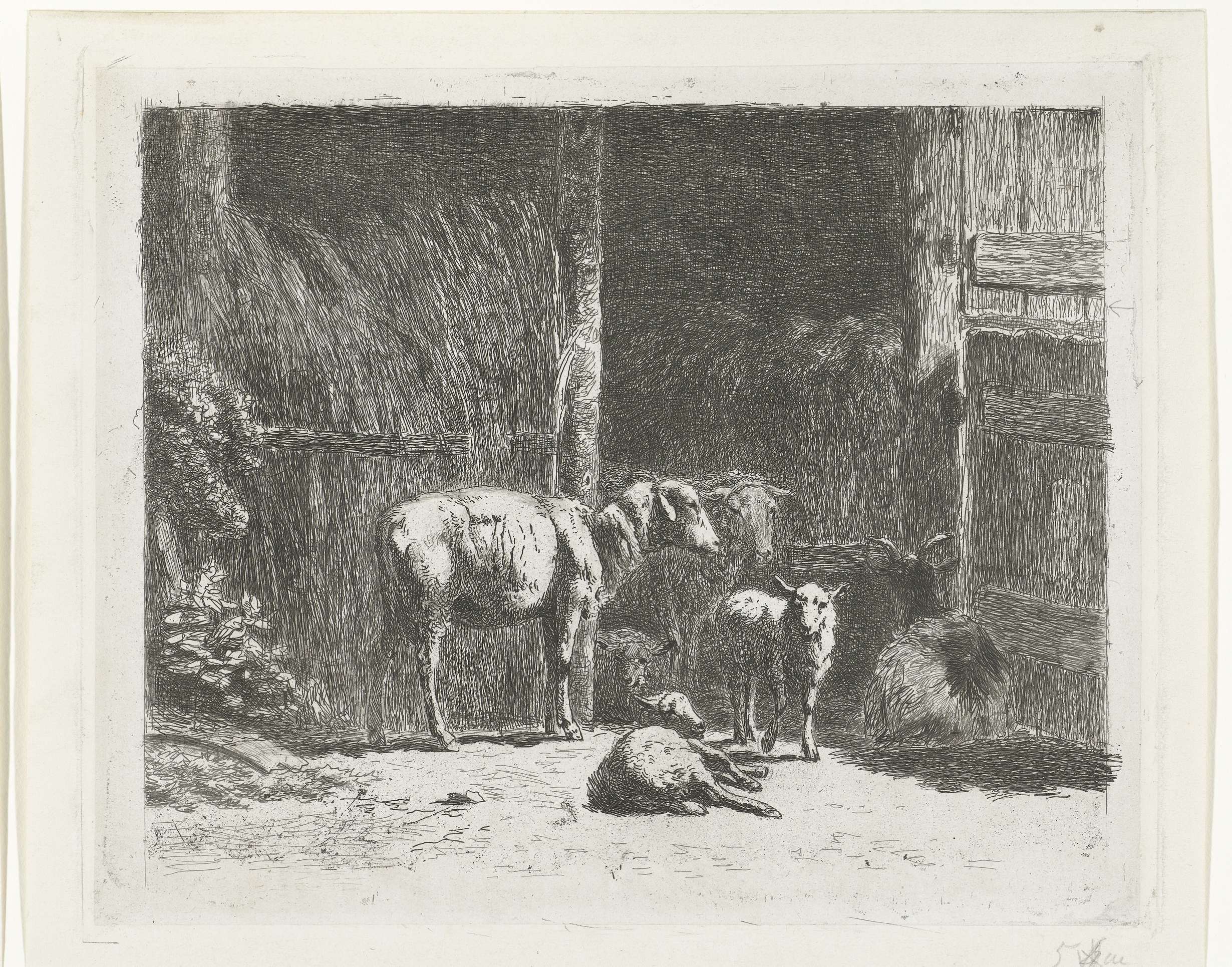 Schapen en lammeren en liggende bok bij stal