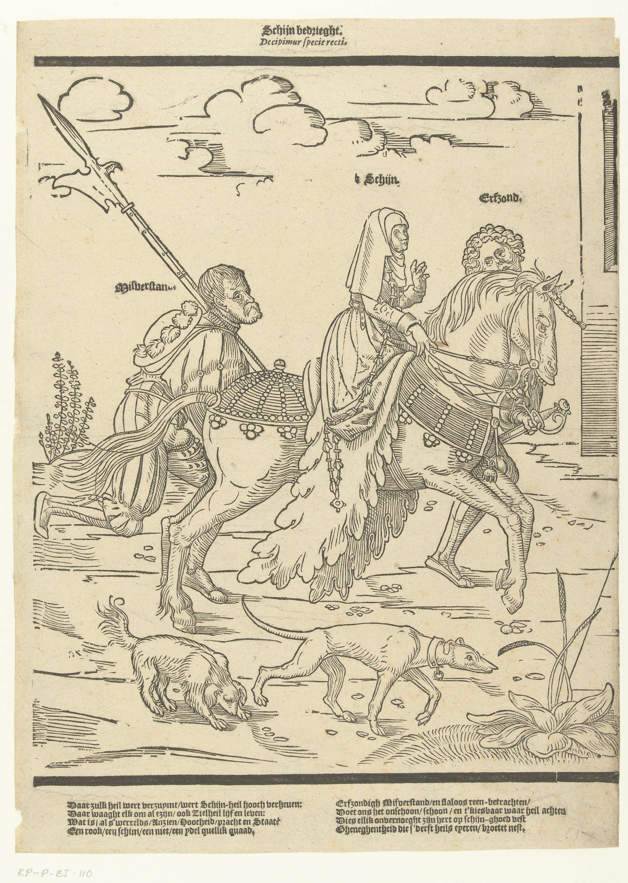 Eén van acht moraliserende spreuken. Schijn te paard met Misverstand en Erfzond als voetknechten. Tekst onder prent