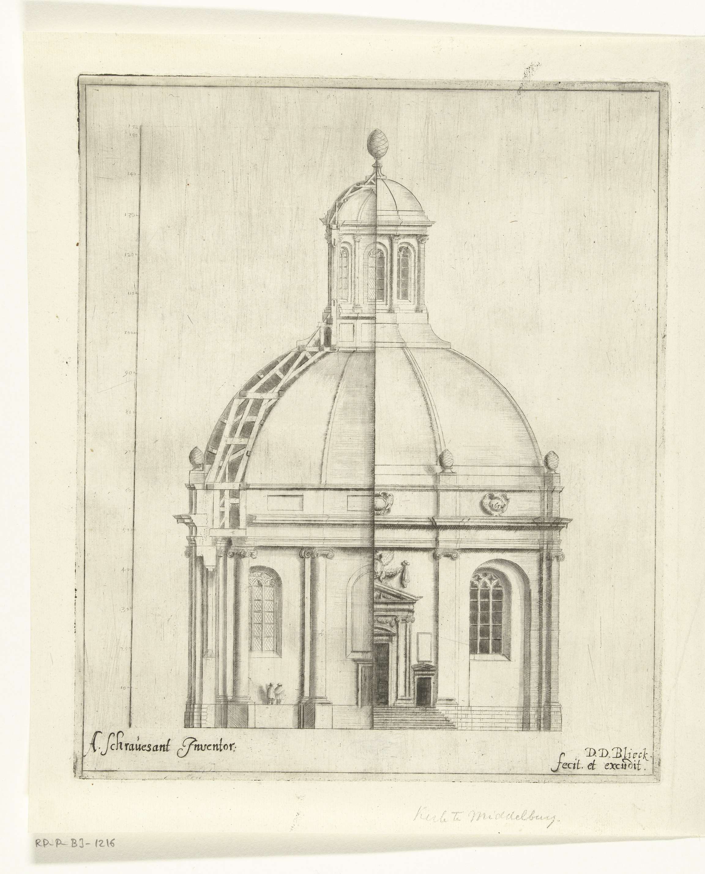 Ontwerp voor de Oostkerk in Middelburg, waarbij zowel het interieur als het exterieur getoond wordt.