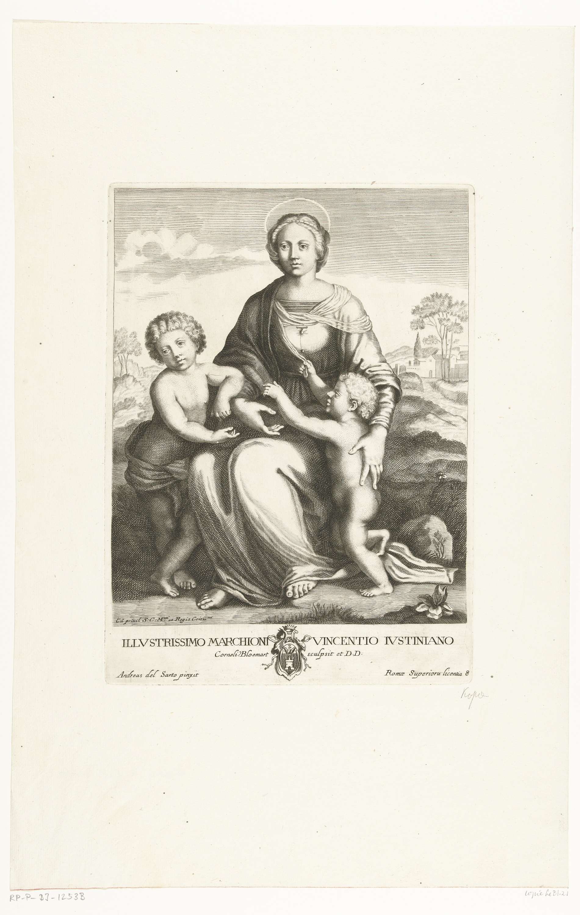 Een zittende Maria, met haar linkerarm het Christuskind omarmend. Aan haar rechterzijde leunt Johannes de Doper tegen haar arm.