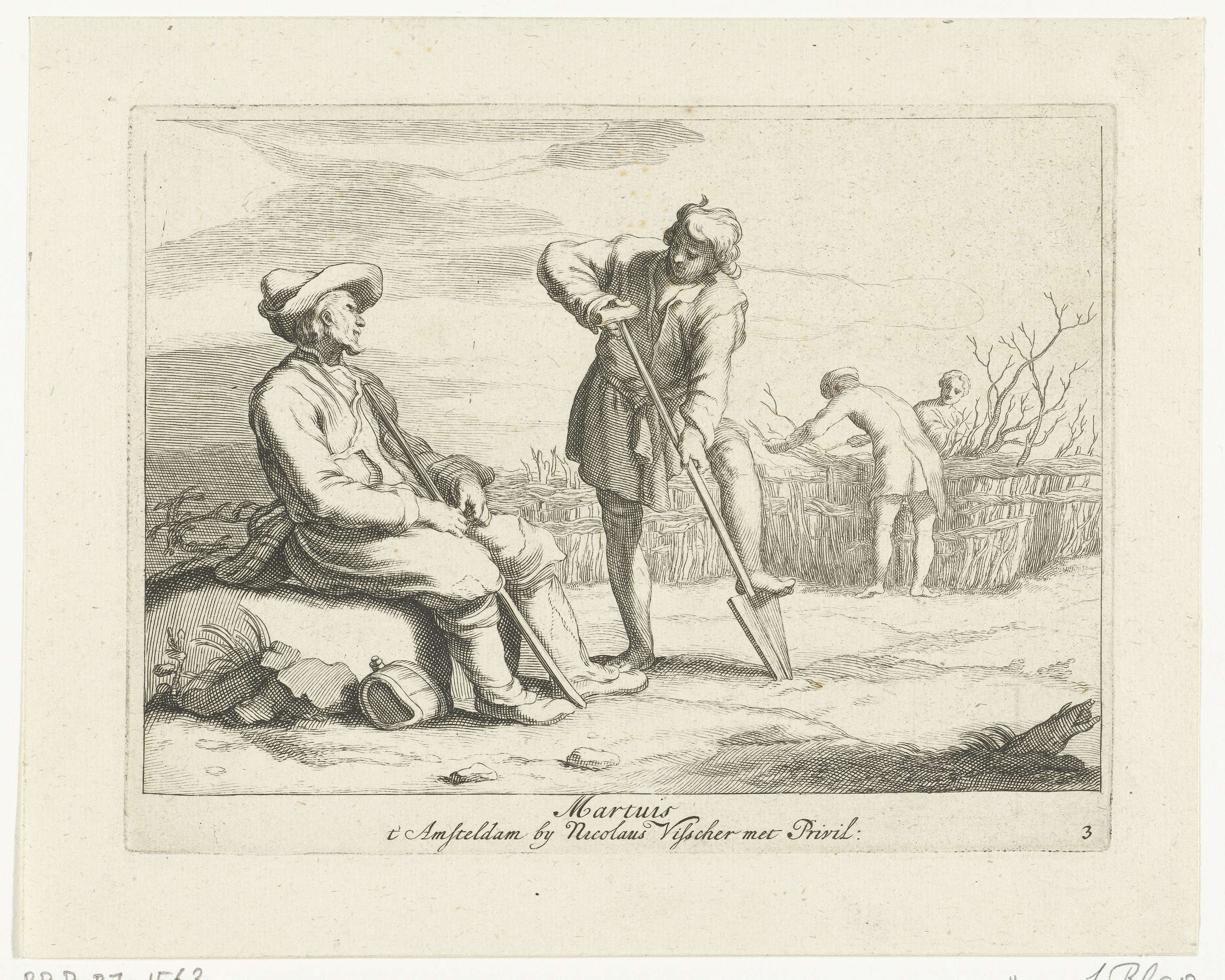 Een oude man met stok die uitrust en een jonge man die met zijn voet een spade de grond insteekt. Op de achtergrond repareren twee mannen een hek.