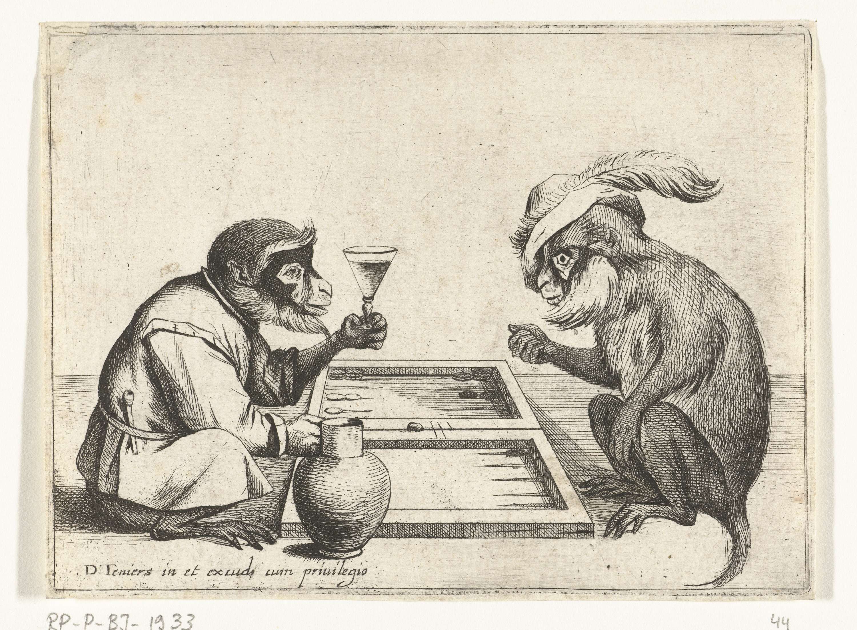Twee apen zitten op de grond naast een triktrakspel. De rechtse draagt een hoed met een hanenveer, de linkse drinkt wijn uit een glas. Prent uit een serie van zes prenten en een titelprent waarin verschillende menselijke bezigheden door apen voorgesteld worden.