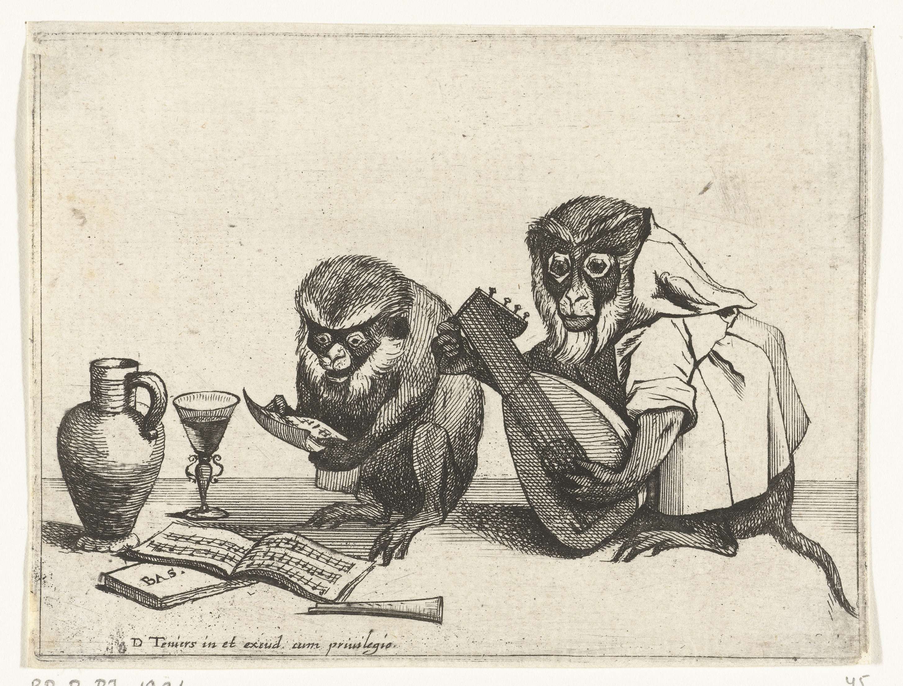 Twee apen hurken op de grond en maken muziek. De ene speelt op een luit, de ander zingt van een muziekblad. Prent uit een serie van zes prenten en een titelprent waarin verschillende menselijke bezigheden door apen voorgesteld worden.
