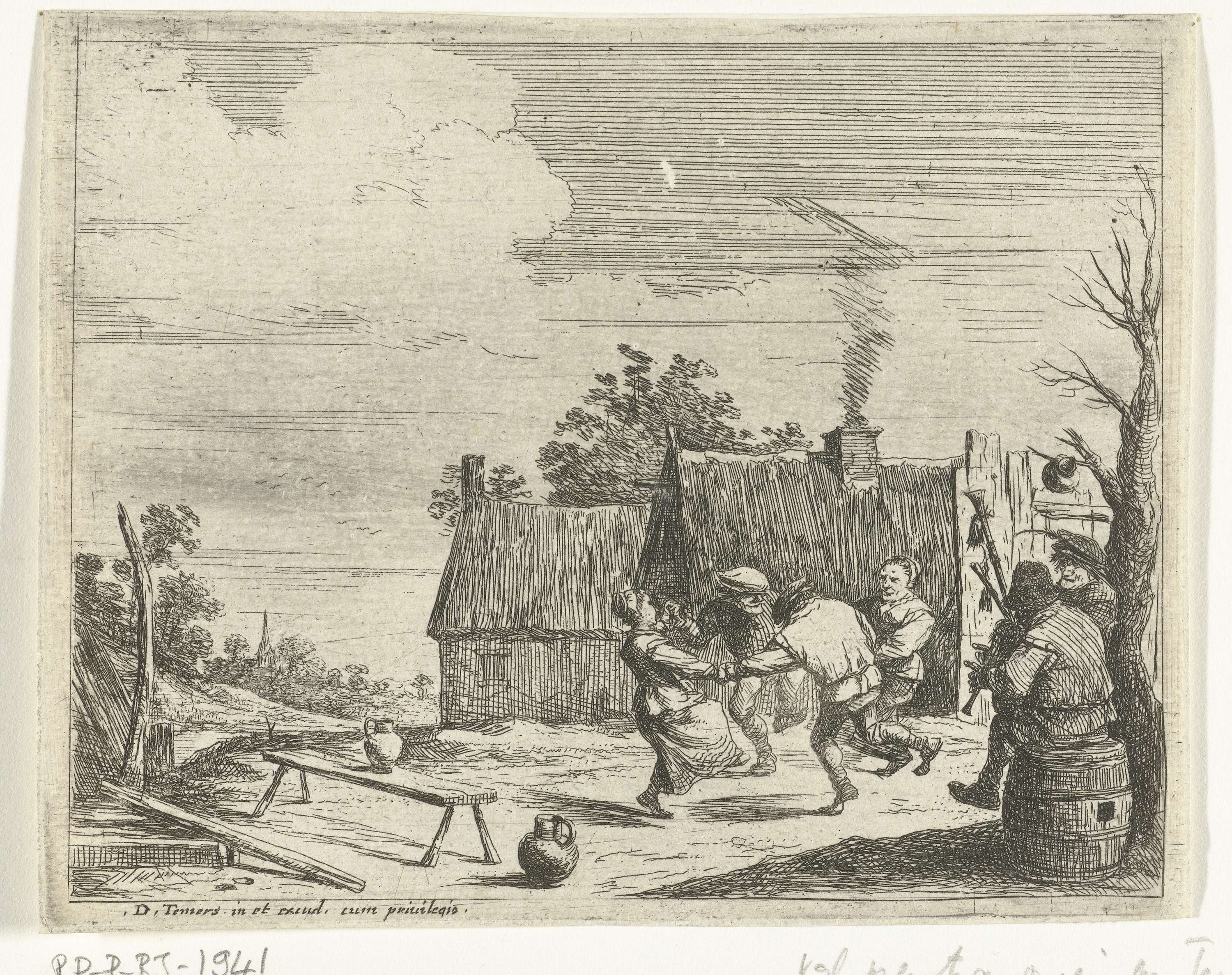 Een groep boeren danst voor hun huis in een cirkel. Rechts zit een man op een vat en speelt op een doedelzak.