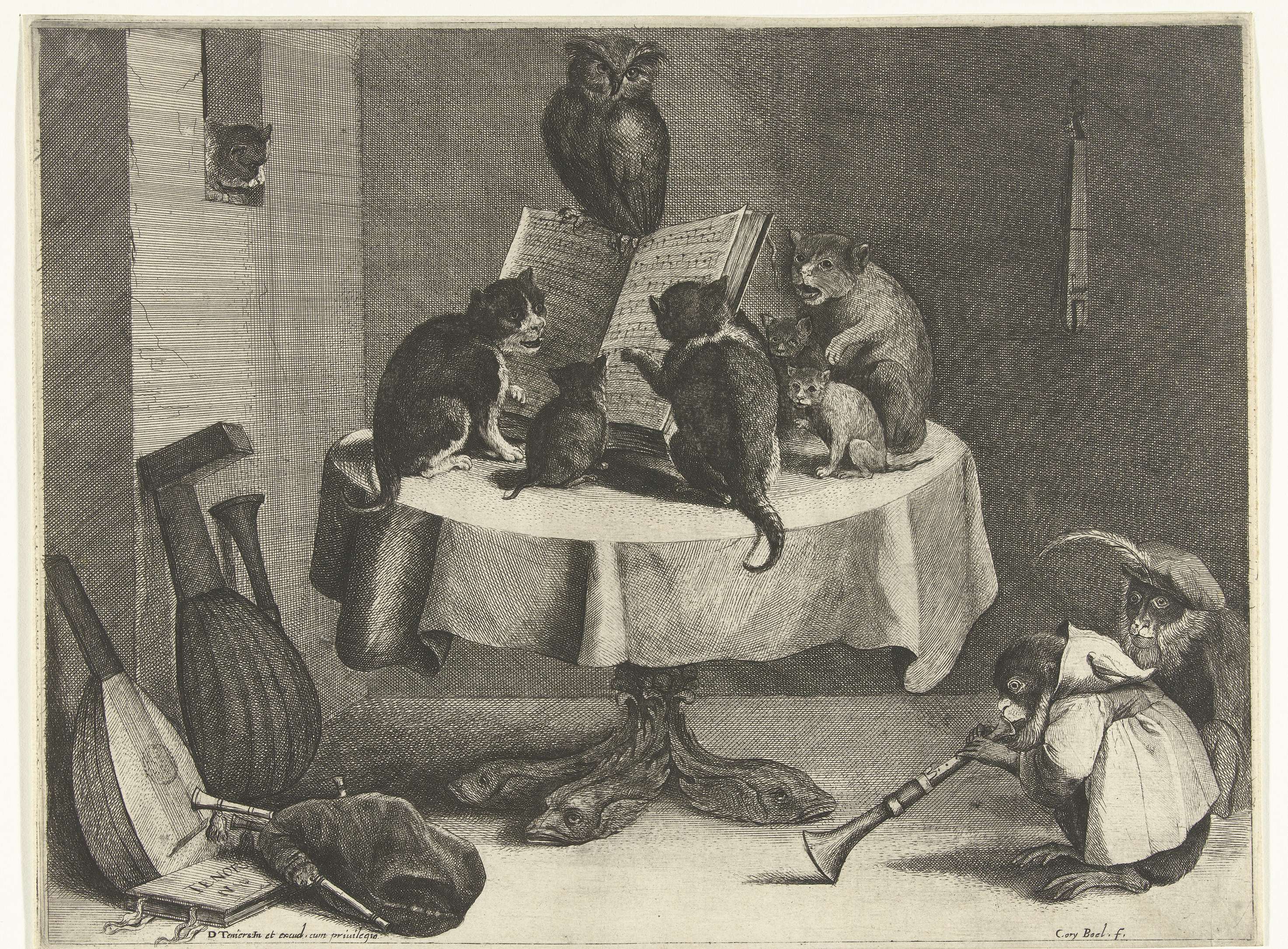 Een groep katten zit op een ronde tafel en zingt uit een muziekboek. Op het boek heeft een uil plaats genomen. Rechts op de grond zitten twee apen, waarvan er een op een schalmei het kattengezang begeleidt.