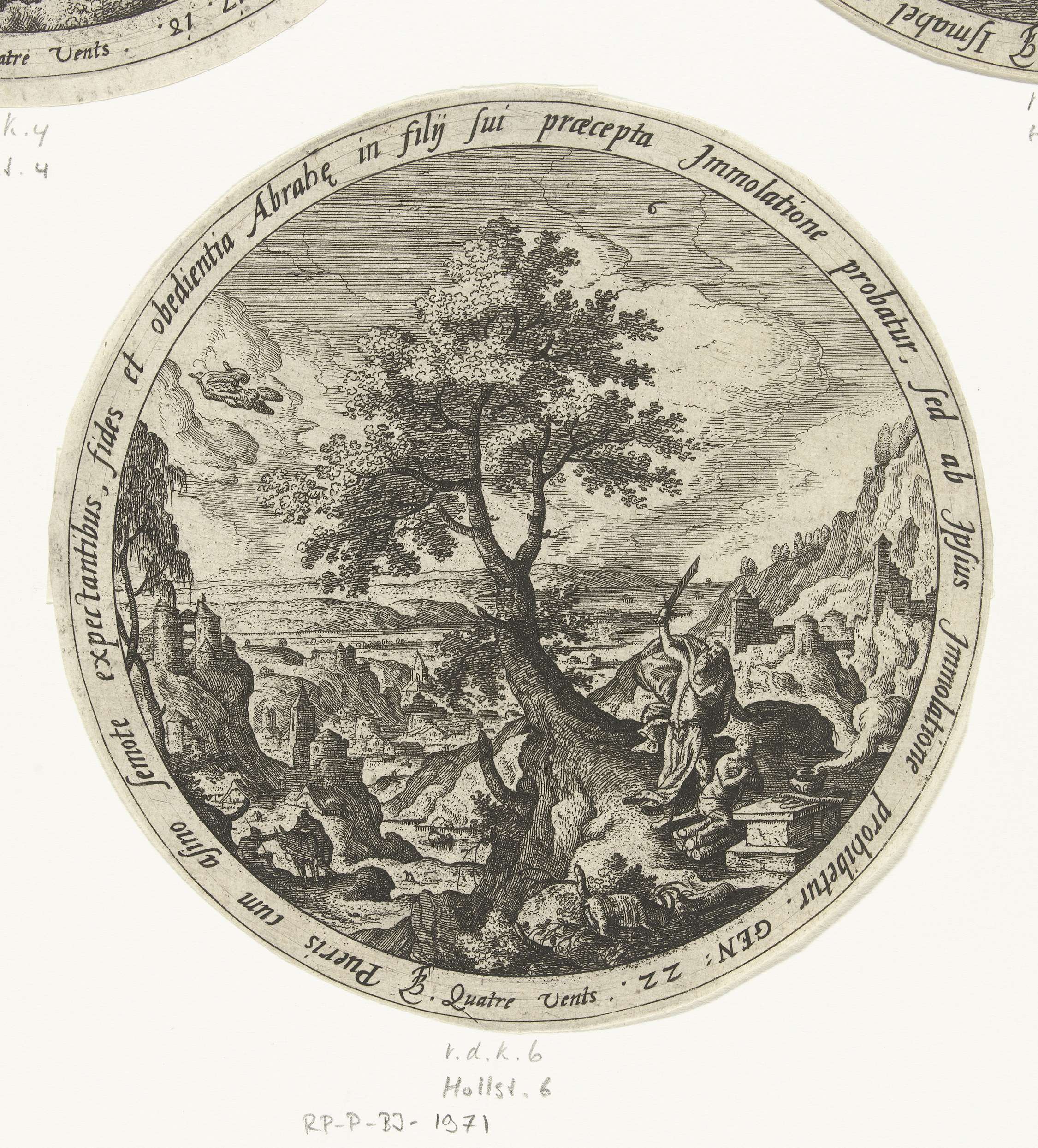 Abraham staat op het punt om zijn zoon Isaak te offeren zoals God het hem heeft opgedragen. Hij ziet de engel die God hem stuurt om het offer tegen te houden. In plaats van zijn eigen zoon offert Abraham een ram die op de voorgrond in de struiken speelt. Prent uit een serie van zes ...
