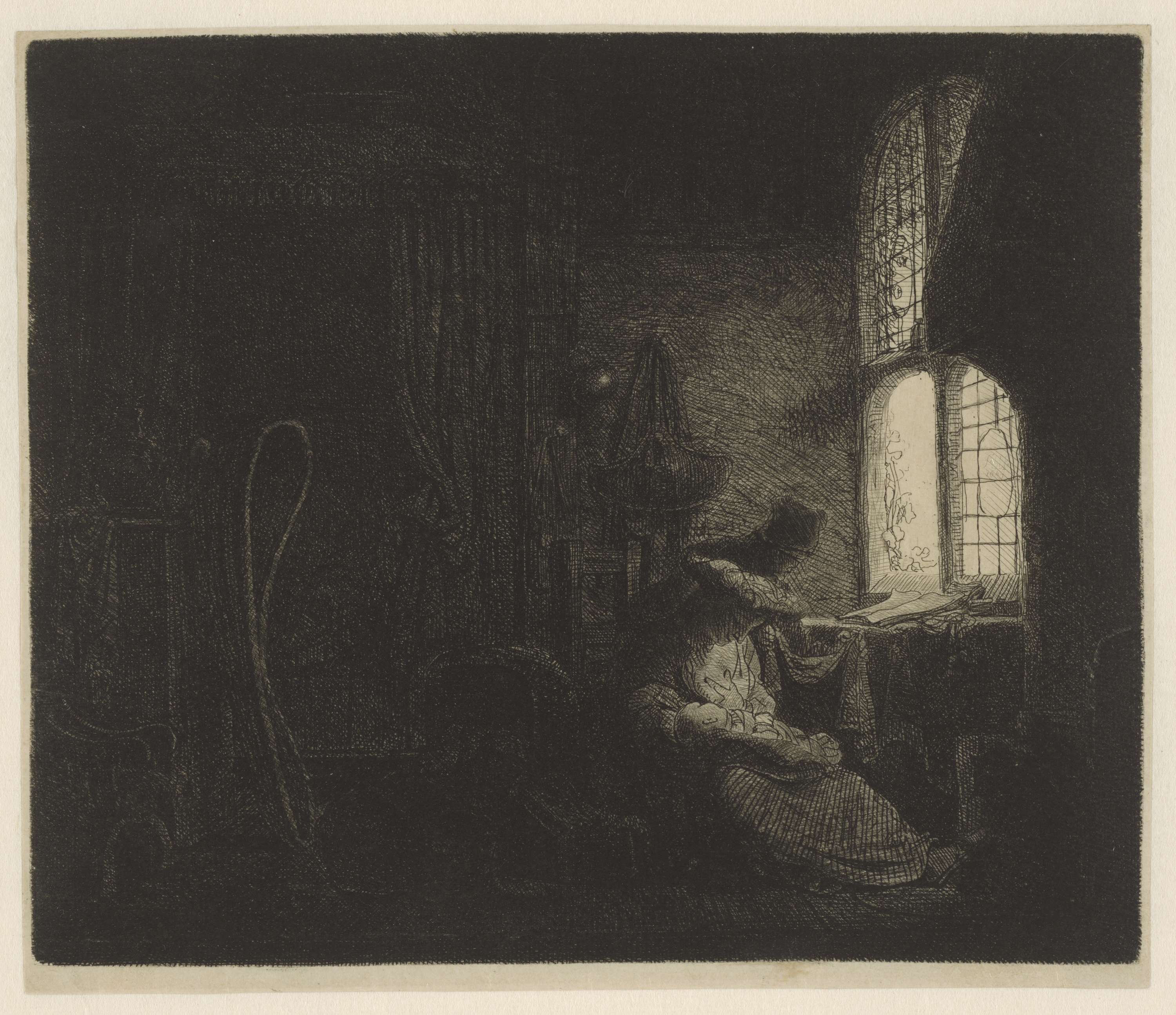 Interieur met man en vrouw die haar kind de borst geeft. Door een raam valt het licht naar binnen.