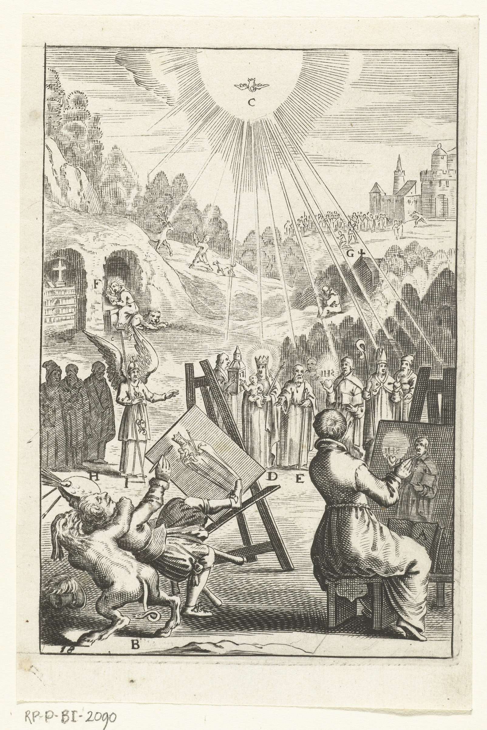 Twee man en een geestelijke zitten achter een schildersezel en schilderen portretten van een heilige. Een engel toont hen een groep heiligen naar wiens voorbeeld zij kunnen leven. De duivel belemmert één van de mannen om te schilderen, hij trekt hem van achteren van zijn kruk.