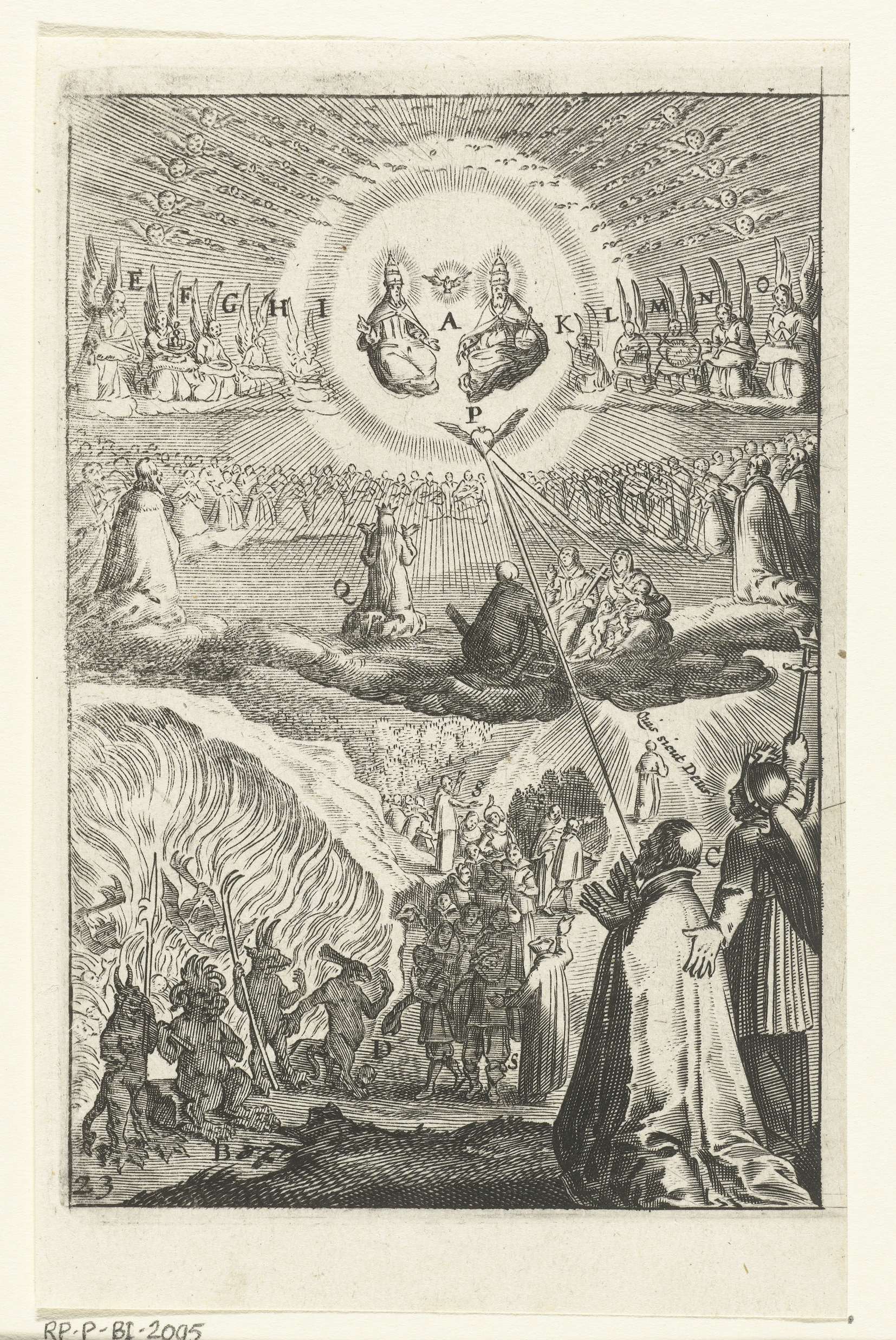 Een engel toont een knielende man twee mogelijkheden. Door te leven in deugd kan hij God dienen. De heilige Drieëenheid is tronend in de hemel met engelenkoren weergegeven. Zijn andere optie is leven in zonde en daarmee de duivel dienen. De duivel als Lucifer troont voor het vagevuur.