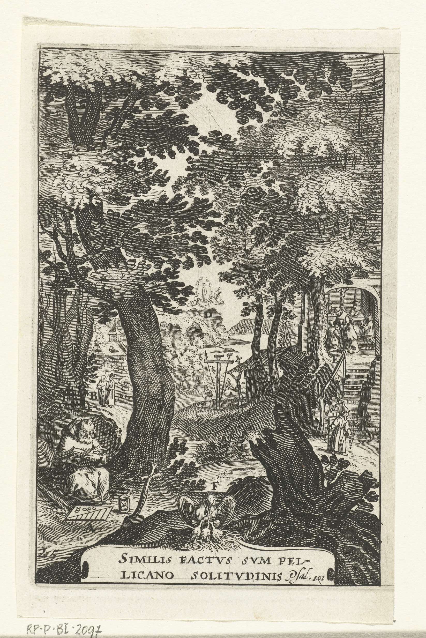 Landschap met een kluizenaar die zich in afzondering verdiept in de bijbel. Kleine scènes illustreren waarin een goede christen moet geloven. In een interieur van een kapel knielen gelovigen en ontvangen een hostie, het heilige sacrament van een priester. Een gelovige mediteert bij een kruis met lijdenswerktuigen van Christus. Nauwelijks zichtbaar tussen het gebladerte van ...
