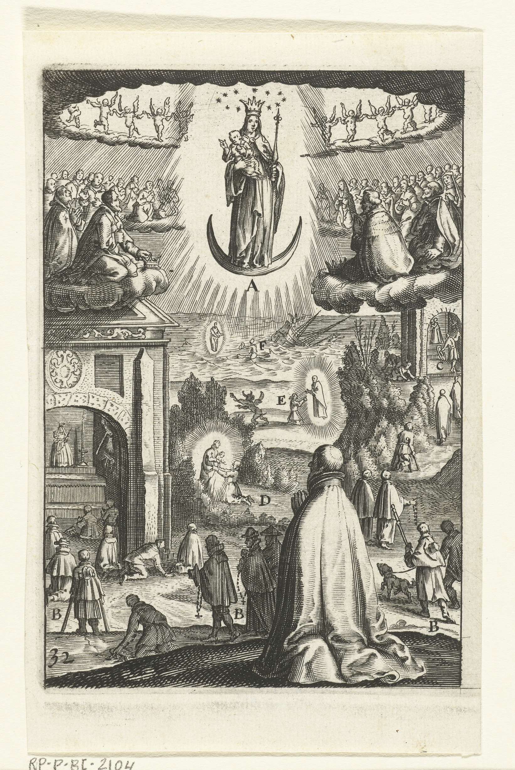 Een man knielt voor Maria met Kind die op de maansikkel aan de hemel verschijnt. Gelovigen eren een Mariabeeld in een kapel en in het landschap worden verschillende personen gered uit een benarde situatie door een Mariaverschijning.
