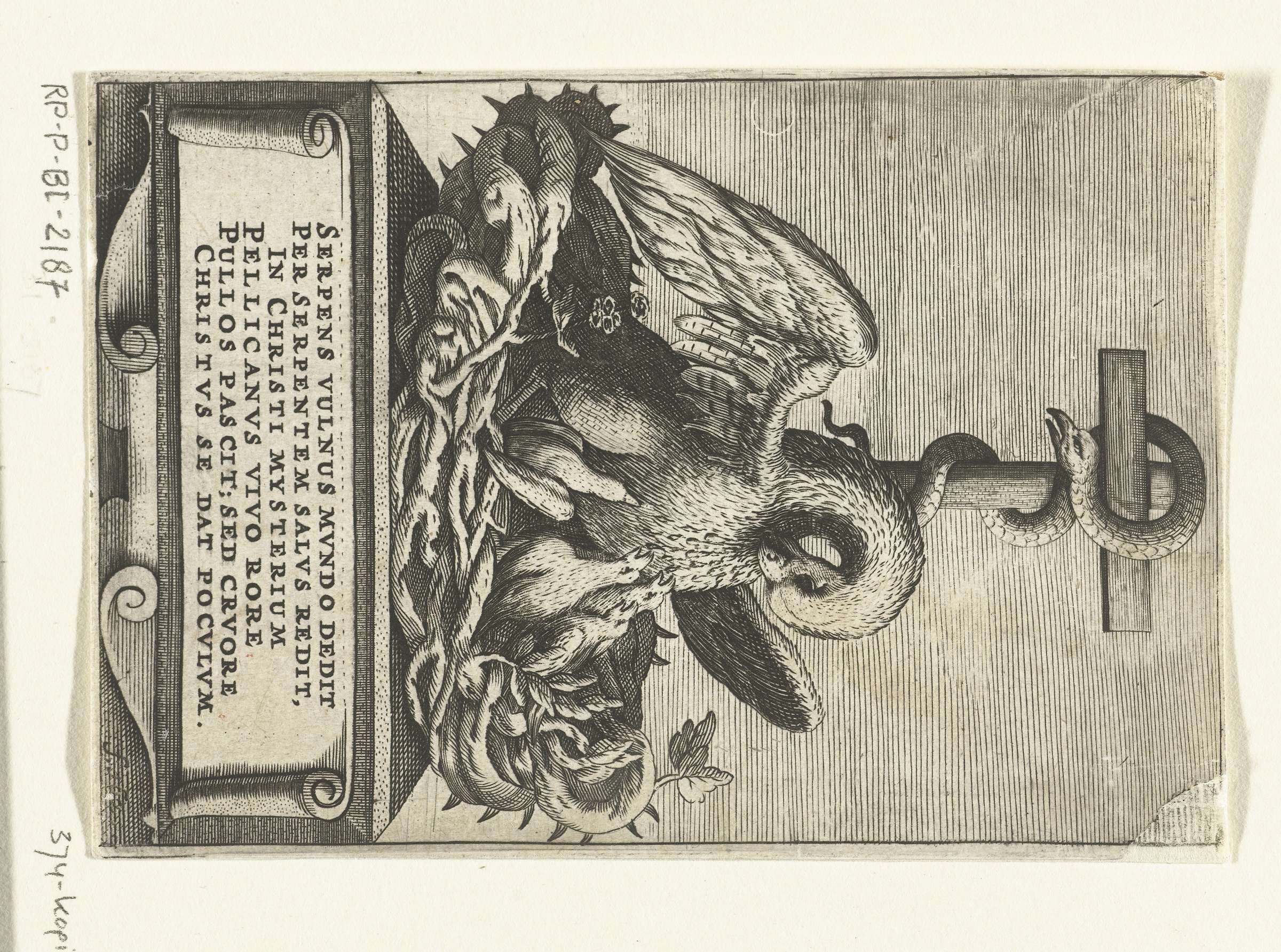 Pelikaan als symbool van Christus nestelt in een doornenkroon en voedt zijn jongen met zijn eigen bloed. De vogel toont meer gelijkenis met een roofvogel zoals een adelaar. Een slang met een vogelkop krult zich om een kruis. In het verklarende vers wordt de vogel een pelikaan genoemd.