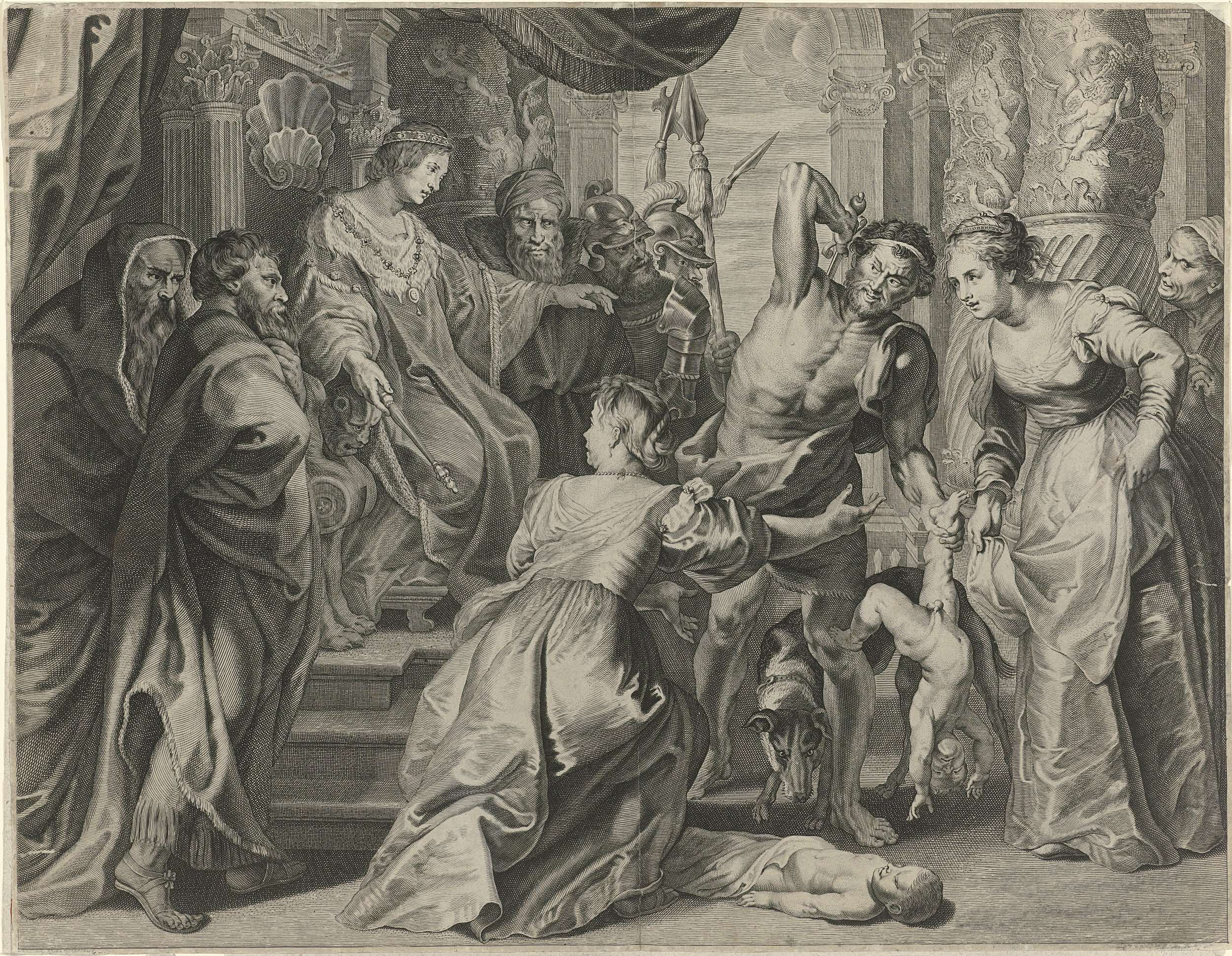 Salomo beveelt een soldaat om het levende kind te doden, de echte moeder van het kind reageert geschokt en probeert de soldaat te stoppen. Op het verso staan twee figuurstudies in zwart krijt uit een latere periode.
