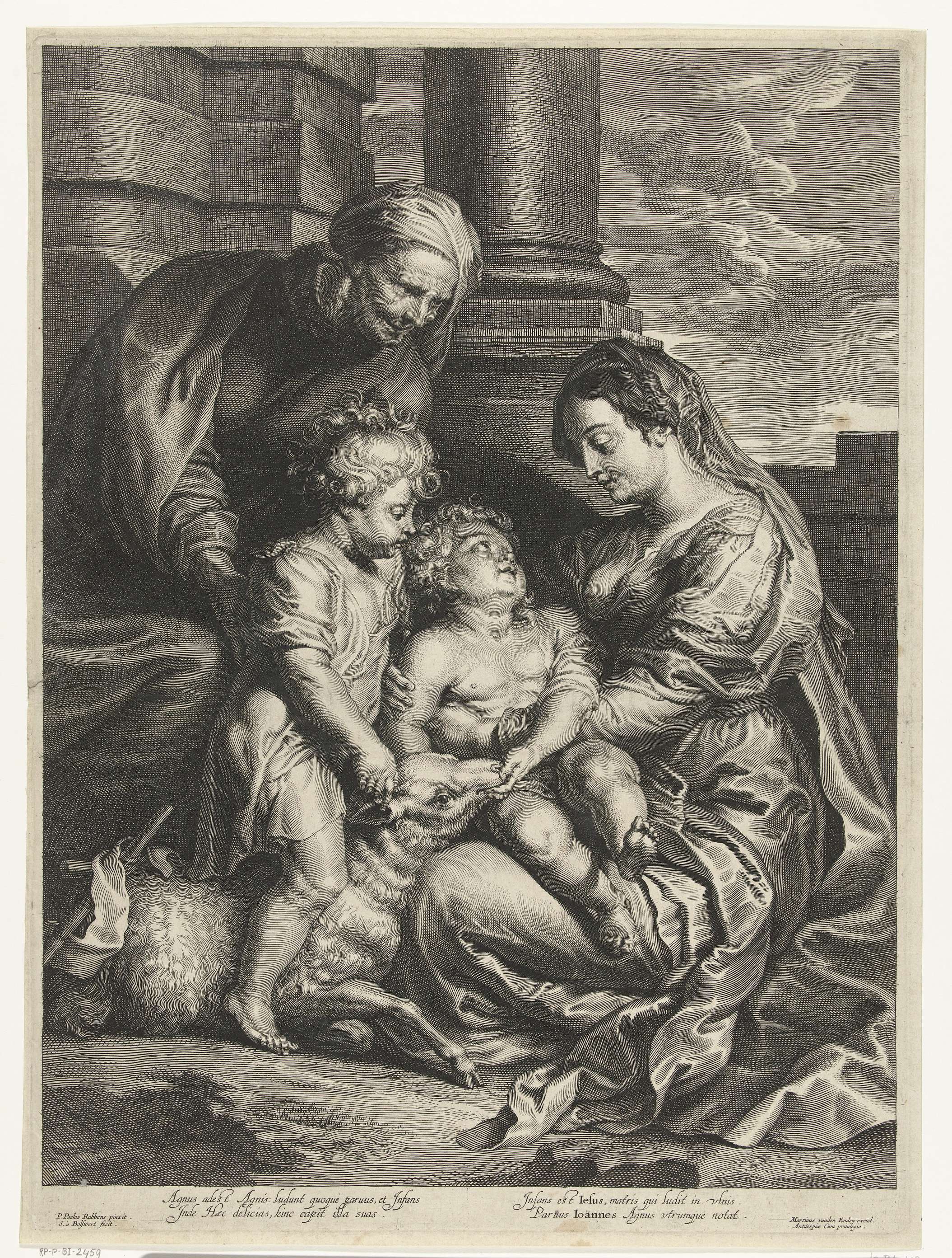 Maria zit op de grond met Christuskind op schoot en de heilige Anna staat met de heilige Johannes als kind en een lam bij hen. Onder de voorstelling staat een Latijns vers.