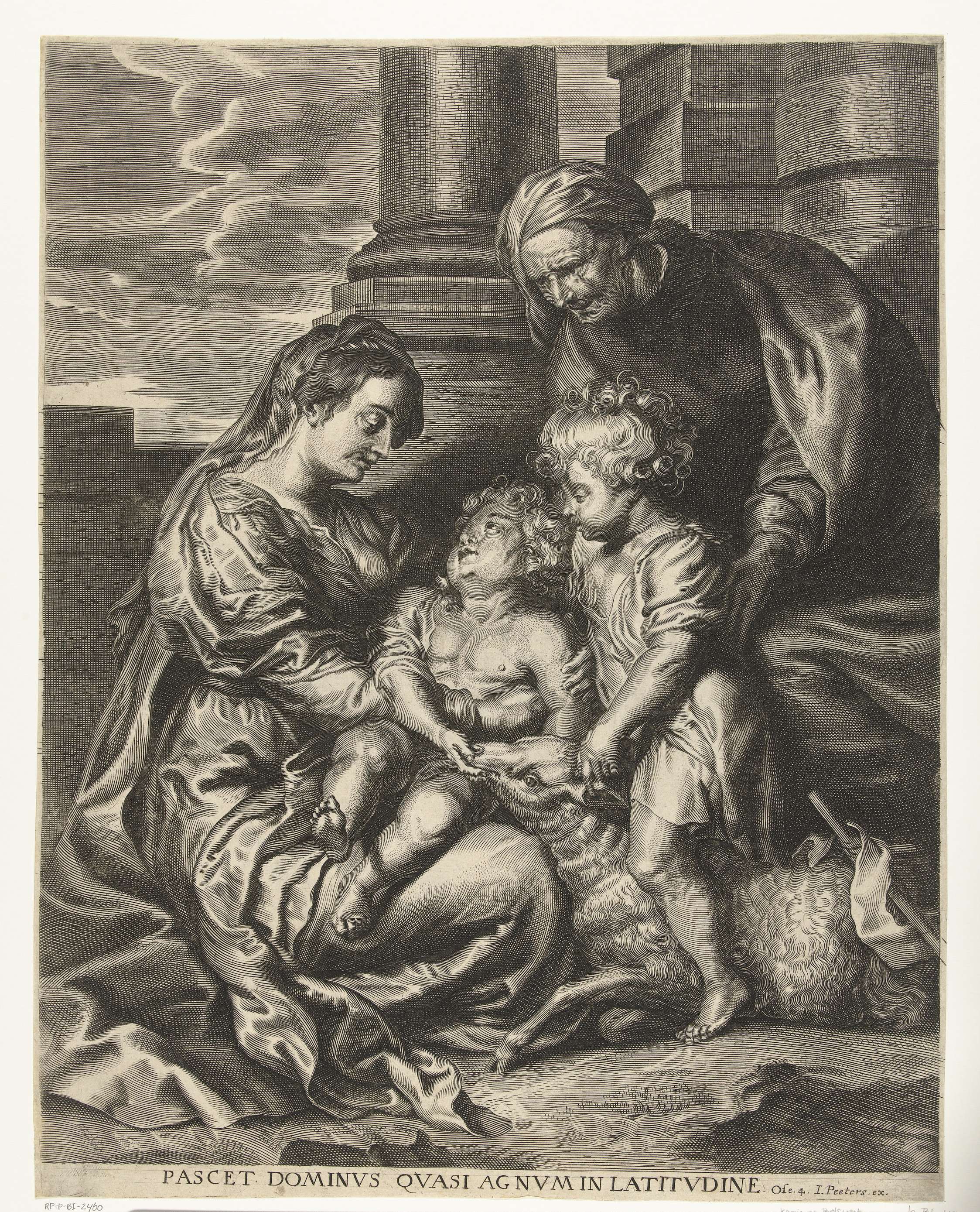 Maria zit op de grond met Christuskind op haar schoot en de heilige Anna en de heilige Johannes als kind met lam staan bij hen. Onder de voorstelling staat een citaat uit het bijbelboek Hosea, vers 4