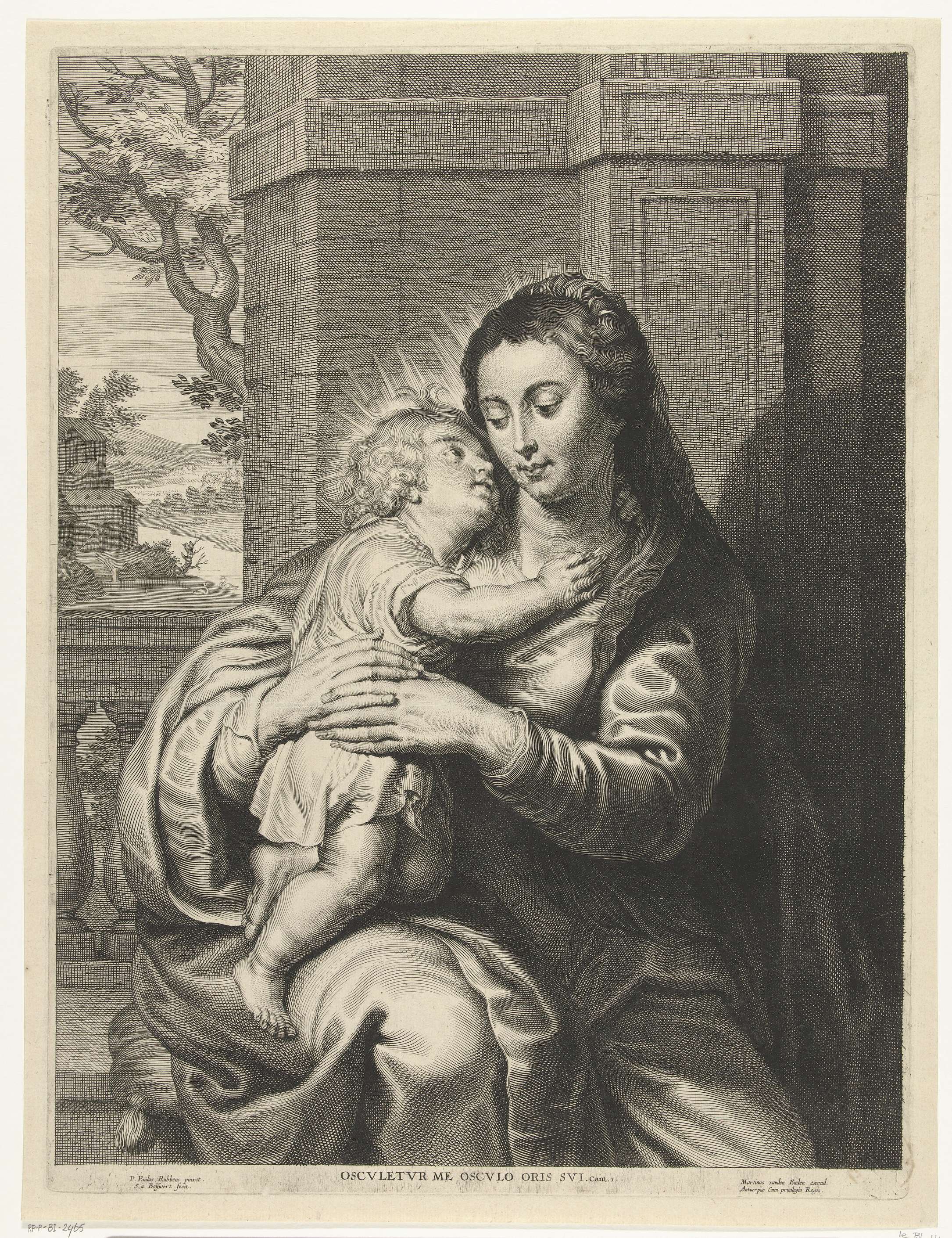 Maria zit met in haar armen het Christuskind dat haar omhelst. Onder de voorstelling staat een citaat uit de bijbeltekst Hooglied 1.