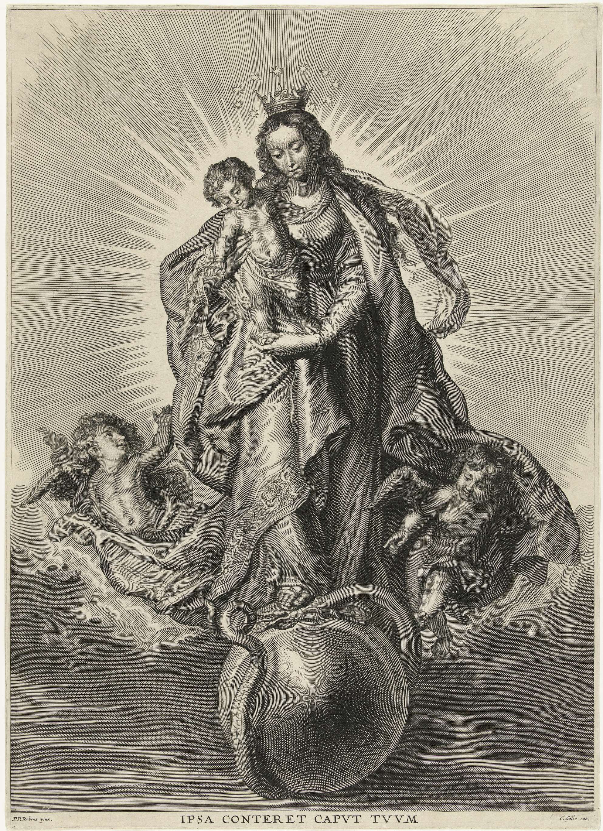 Maria met kind staat op de wereldbol en vertrapt een slang of duivel. Twee kleine engelen houden de slippen van haar mantel vast. Onder de voorstelling staat een Latijns citaat uit bijbeltekst Genesis 3.
