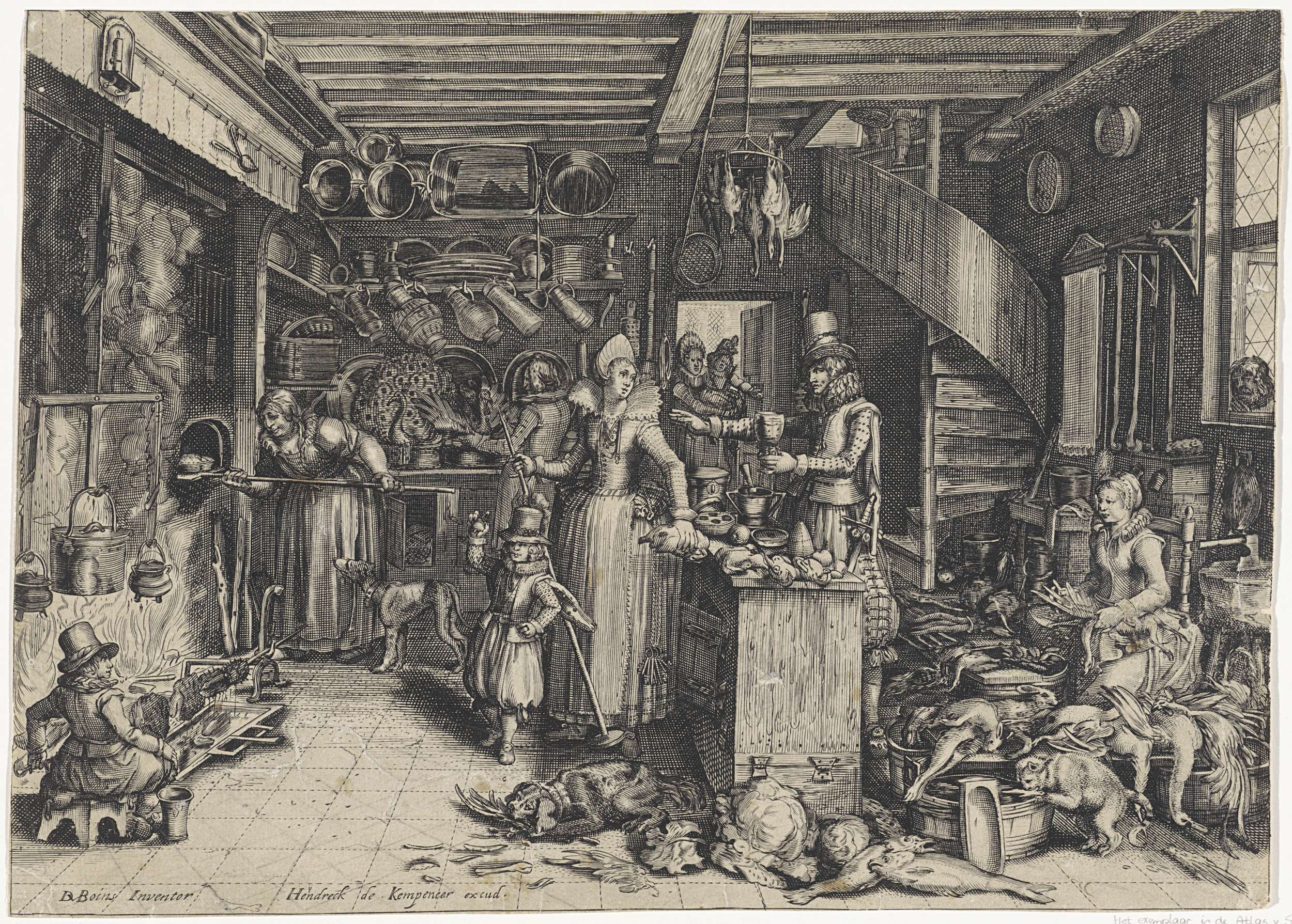 Interieur van een keuken met leden van een welgestelde familie, veel keukengereedschap en etenswaren. Links wordt gevogelte geroosterd en bakt een oude vrouw brood. Rechts plukt een keukenmeid een vogel.